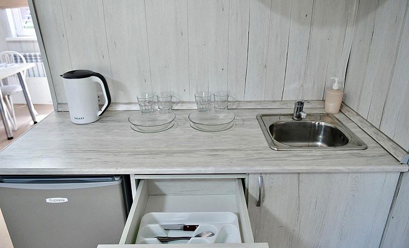 3 односпальные кровати, телевизор, wi-fi, мини кухня, микроволновая печь, холодильник, чайник, столовая посуда, с/у с душем.