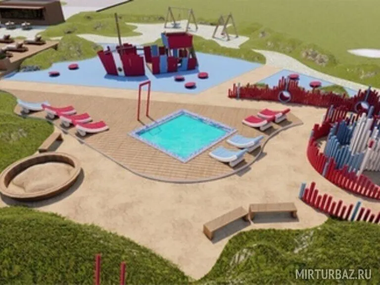 Детский бассейн расположен недалеко от взрослого. Безопасность отдыха обеспечивают оптимальная для ребенка глубина чаши и комфортный вход в воду. Рядом с детским бассейном расположена зона отдыха и игр.