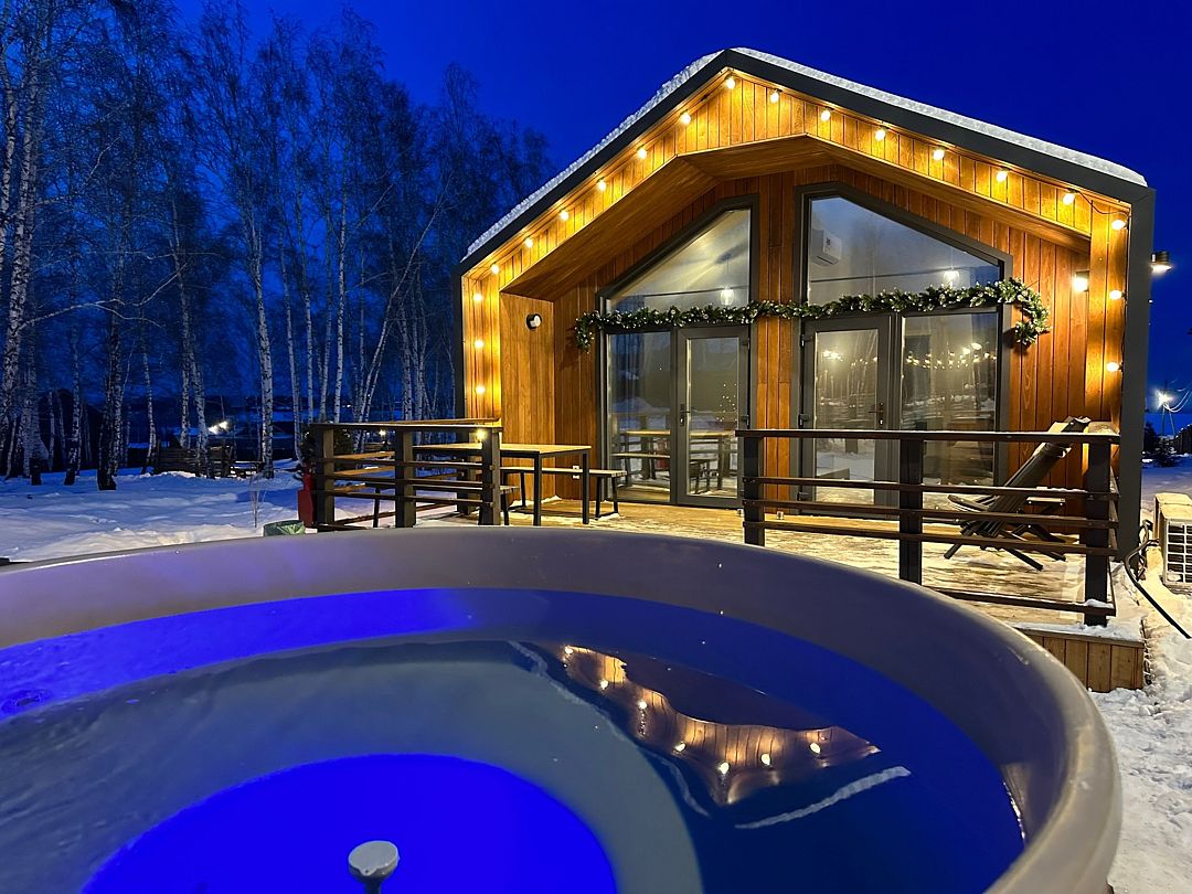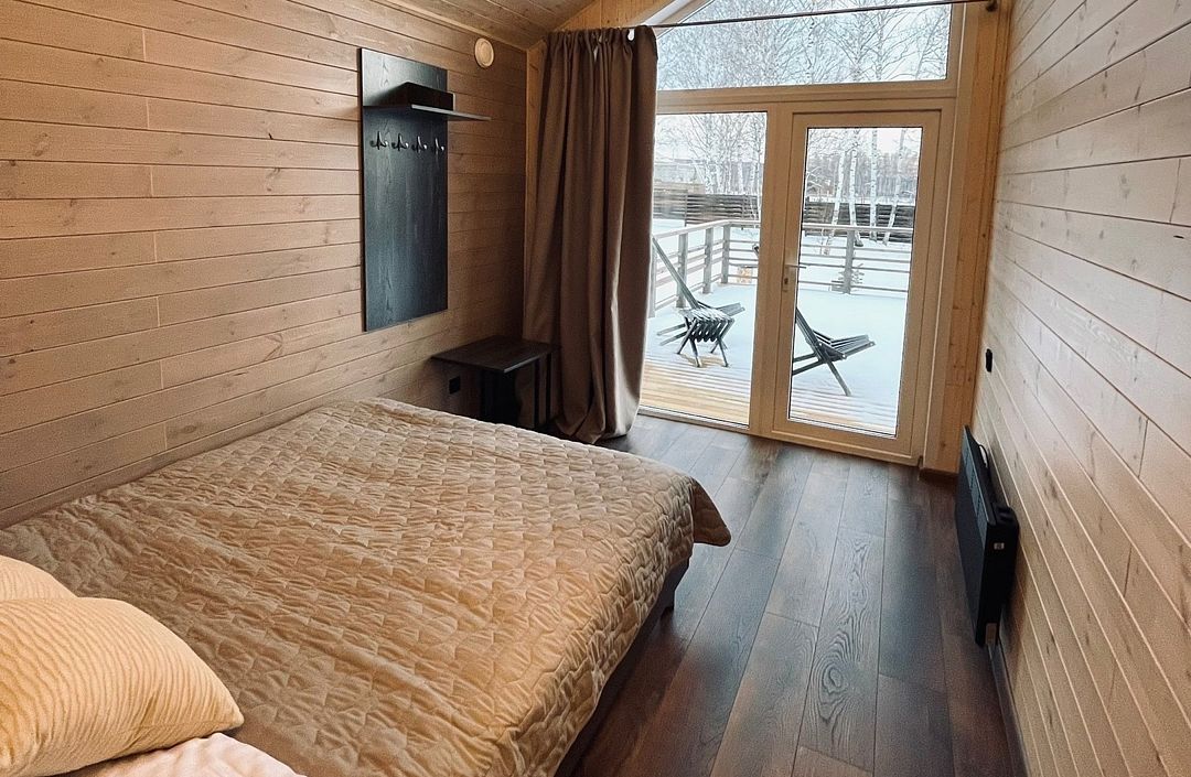 Домики рассчитаны на размещение 2–6 человек. Везде теплые полы, гостиная, совмещенная с кухней, персональный санузел с душевой, перед каждым домиком – терраса с креслами и обустроенная зона барбекю. Все дома укомплектованы бытовой техникой: есть холодильник, микроволновка, варочная панель, чайник, фен, телевизор.
