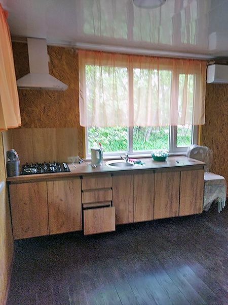 В домике имеется кухня площадью 20 м2 оборудованная всем необходимым, а именно газовой плитой, холодильником и посудой, так же на кухне имеется обеденный стол и телевизор, со спутниковыми каналами.