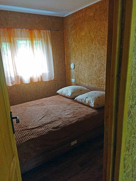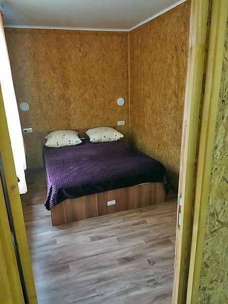 5-ти местный домик со всеми удобствами, имеет две изолированные спальни площадью 16 кв.м. каждая, одна спальня оборудована двуспальной кроватью, вторая двумя односпальными и диваном-кроватью.