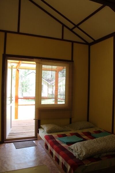 Домики, поделённые на два двухместных номера. Каждый номер оборудован санузлом, в номере есть, холодильник, чайник, двухспальная или две односпальные кровати, постельные и гигиенические принадлежности, мебель.
