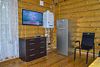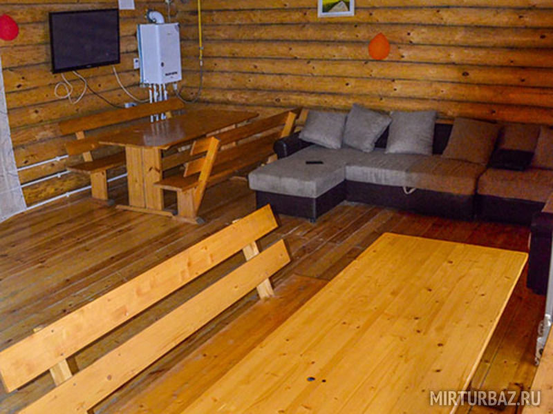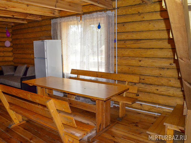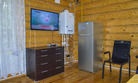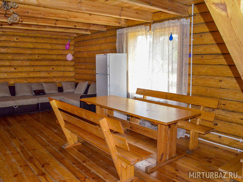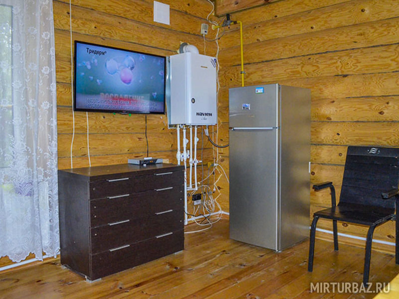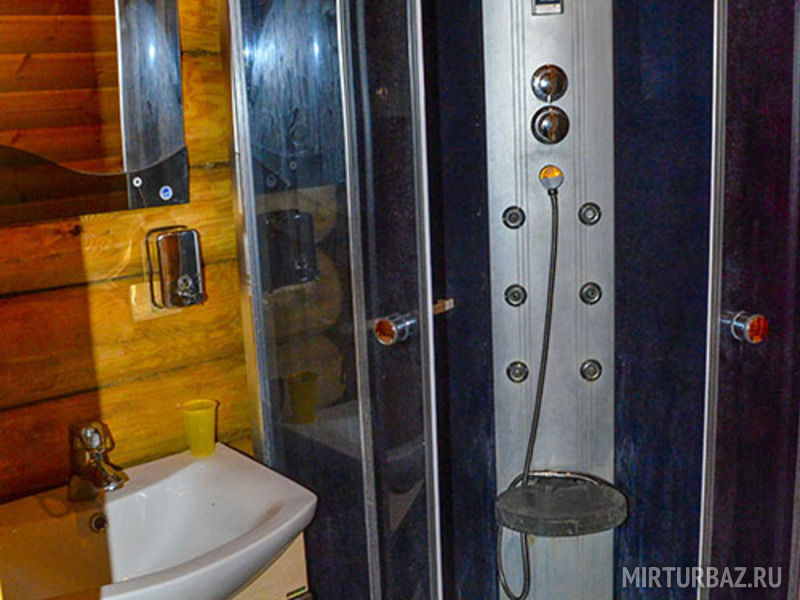 Также на кухне имеется вместительный холодильник, большой телевизор, на котором вы сможете посмотреть ваши любимые передачи. В наших домиках всегда есть горячая вода, так как имеется водонагреватель. Еще на первом этаже расположена ванная комната, где находятся туалет и душевая кабина с раковиной и зеркалом. Просторность первого этажа позволит вам провести любой праздник с большим количеством людей.