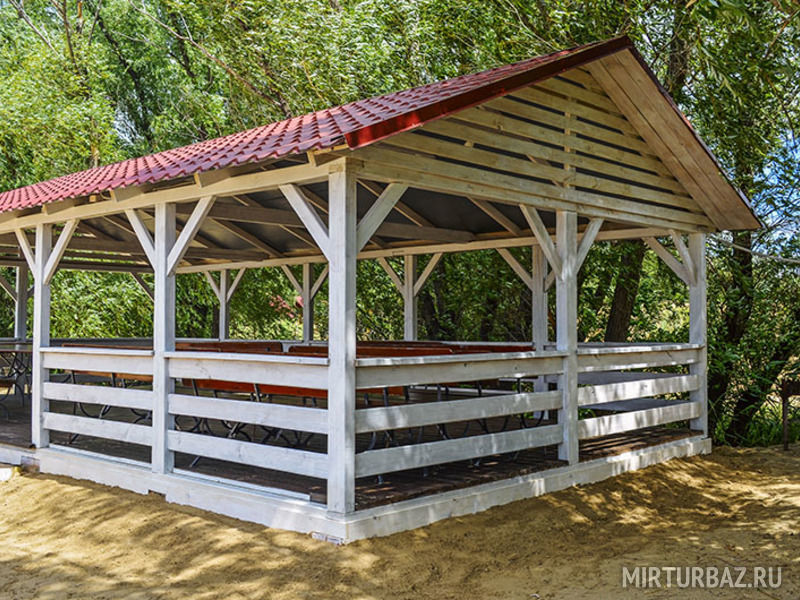 Обособленная территория каждой беседки выложена плиткой, имеется холодильник, мангал и возможно подключение музыкальной аппаратуры. К Вашим услугам большие деревянные столы и удобные лавки. Здесь Вы можете отметить свой праздник, собрав до семидесяти гостей.