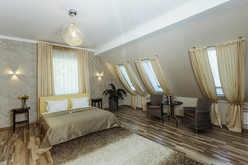 Двуспальная кровать, холодильник, ТВ, кондиционер, Wi-fi, фен, двуспальный диван, халат, тапочки, room-service с 5.00 до 23.00, сейф, шкаф купе, санузел, джакузи, средства гигиены.
