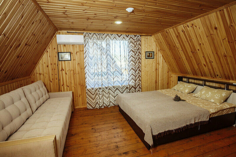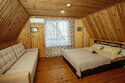 Двухэтажный сруб на 10-15 человек. На первом этаже баня, душ, туалет, комната отдыха с двуспальным диваном, ТВ, кондиционер, кухня с микроволновой печью, холодильником, посудой, чайником. На втором этаже две спальни и дополнительное спальное место, кондиционер. Площадка с мангалом, большая веранда на воде.