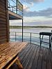 В доме на первом этаже располагается гостиная с кухней, оснащенной всем необходимым инвентарем, имеется холодильник, микроволновка, телевизор, большой стол на 8 персон, диван, два кресла. Есть баня с дровяной печкой, душ, санузел. Весь первый этаж оборудован теплым полом. На втором этаже две спальни. В большой спальне двуспальная кровать (180х200), раскладной диван, комод, TV, кондиционер. В маленькой – двуспальная кровать (160х200), детская кровать, стул для кормления. Предоставляется белое белье для всех спальных мест.