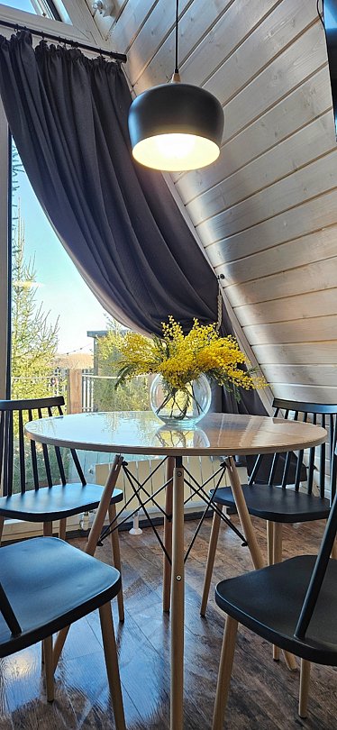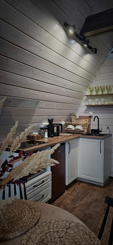 В домике всегда тепло и уютно, независимо от времени года. Кухня полностью оборудована всем необходимым для приготовления еды. В ванной комнате есть всё, что может понадобиться как для краткосрочного, так и для длительного проживания: утюг, гладильная доска, стиральная машина, полотенца и прочие удобства.