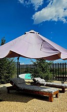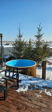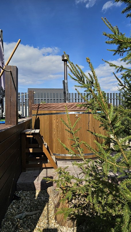 Прямо возле террасы домика вы сможете попариться в горячей купели под открытым небом. Купель также можно использовать как тёплый бассейн.