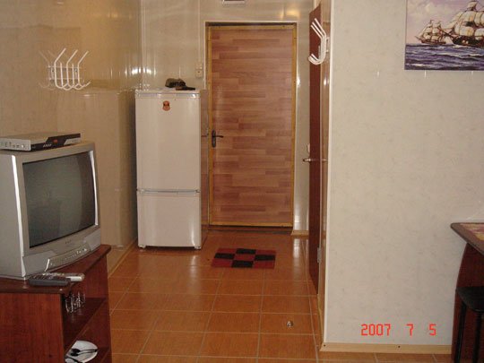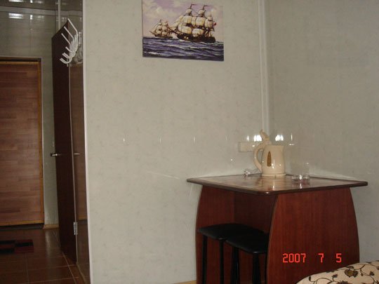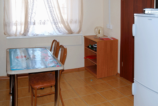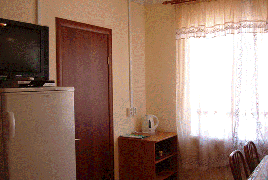 В номере есть необходимый набор посуды (тарелки, чашки, стопки, ложки, вилки, разделочная доска), электрический чайник, пепельница, солонка, поднос, открывалка для бутылок.