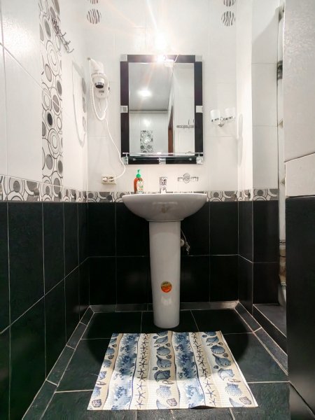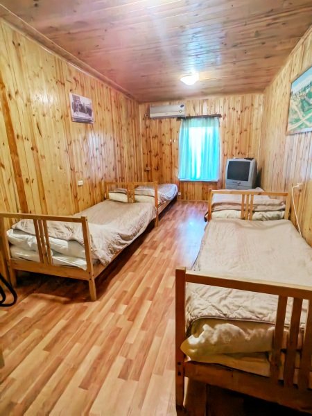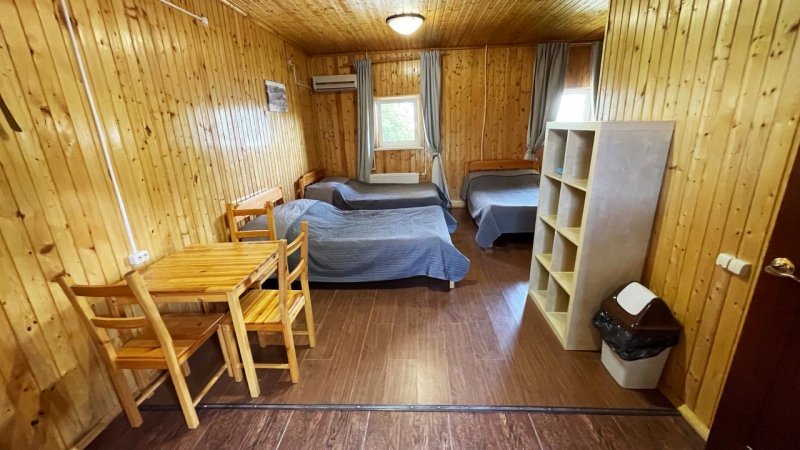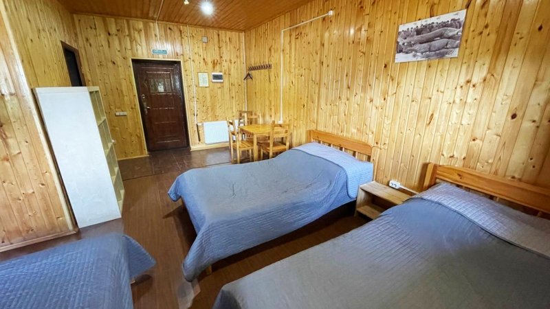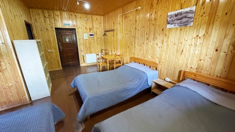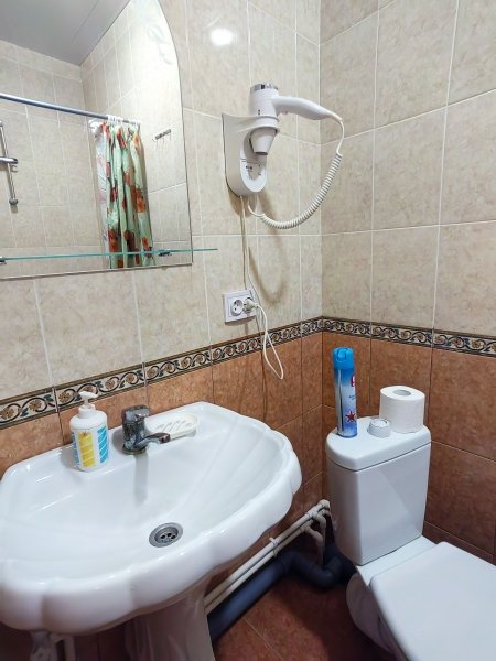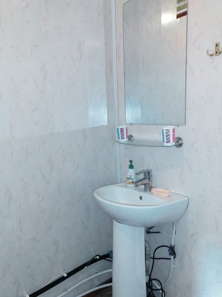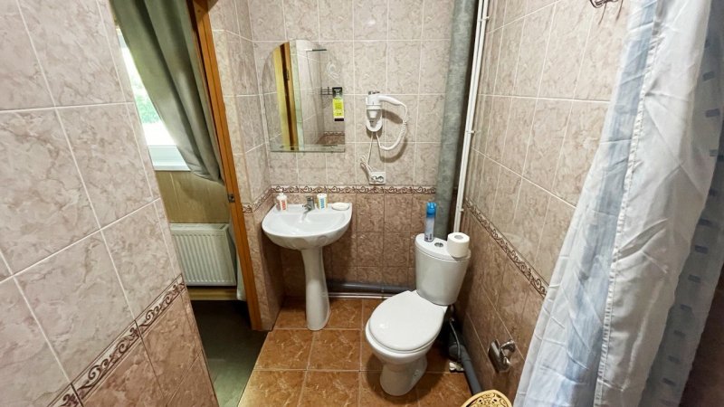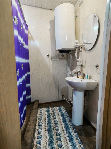 Номер «Эконом» на 3 гостя оснащен комфортным санузлом (2 душевые, туалет, умывальник, фен), совмещенным с номером «Эконом» на 2 гостя. Санузел расположен в холле между двумя номерами. Вам не нужно выходить на улицу для того, чтобы попасть в душ или туалет.