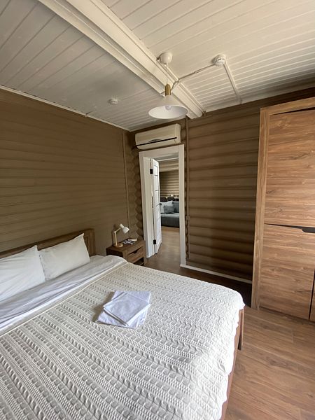 В коттедже 2 комнаты: спальня - одноместная кровать, шкаф, тумбочка; гостиная - двуспальная кровать, диван ( раскладной), ТВ , кондиционер, платяной шкаф, стол, стулья , санузел совмещенный (туалет, душевая кабина, горячая и холодная вода), холодильник; кухня - кухонный уголок (посуда, эл. чайник). внутренняя телефонная связь, кондиционер, веранда - стол, стулья, морозильная камера.