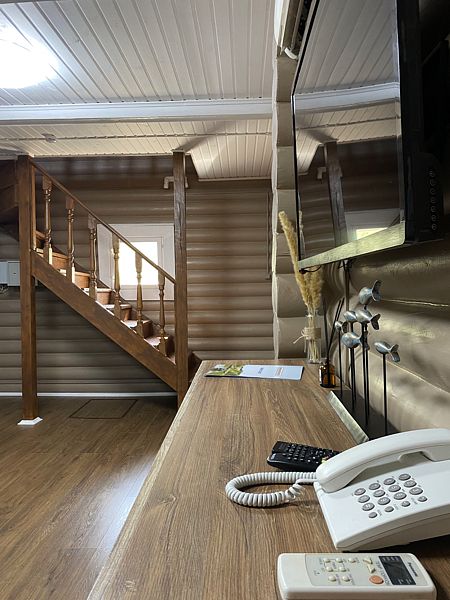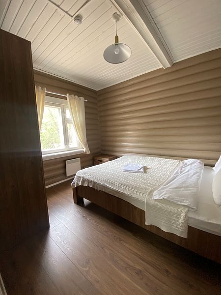 Гостевой номер в административном корпусе - проживание 2-3 чел. Все дома выполнены из рубленного дерева, по старорусским технологиям. У каждого коттеджа своя зеленая территория с плодовыми деревьями. Вся современная начинка внутри дома, от кондиционера до профессиональной морозильной камеры.
