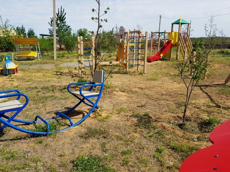 Детский игровой комплекс оснащен башенкой, горкой, шведской стенкой, канатом и рукоходом. Рядом расположены качели, качалка-балансир , песочница, скамейка-паровозик и счеты на столбах для малышей.