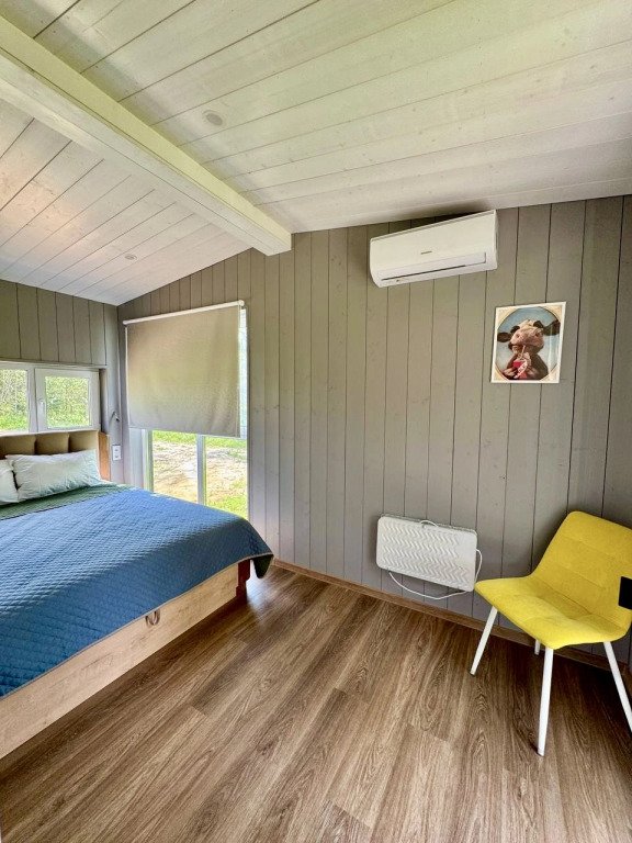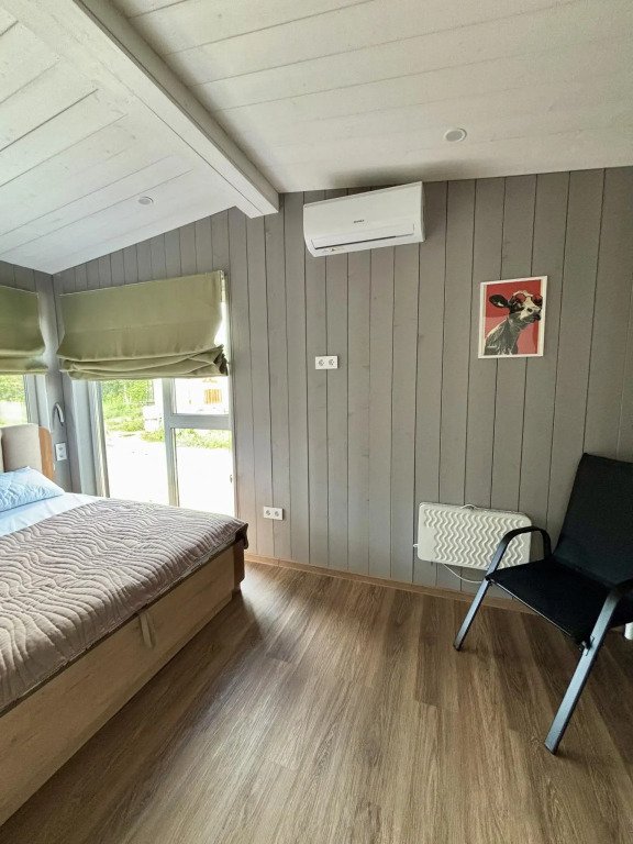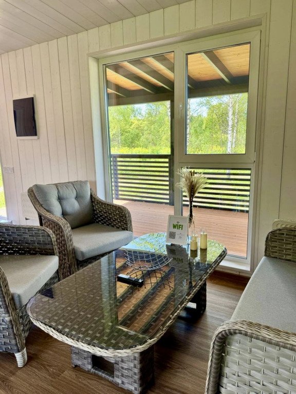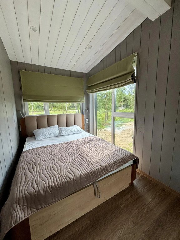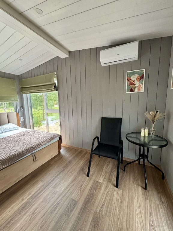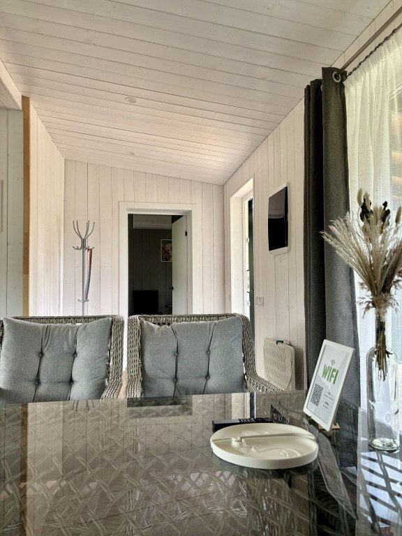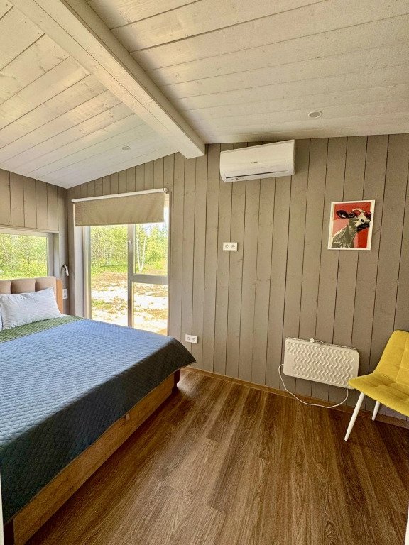 К услугам гостей деревянные домики с панорамными окнами, террасами и родниковой водой, текущей из крана. Каждый дом имеет 3 комнаты: 2 спальни с двуспальными кроватями и общую обеденную зону с кухонным гарнитуром и необходимыми принадлежностями. Интерьер выполнен в деревенском дизайне с использованием экологичных материалов.