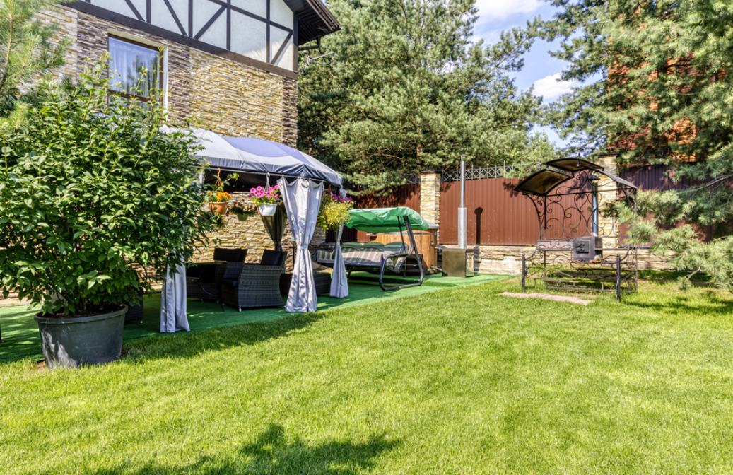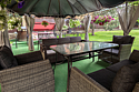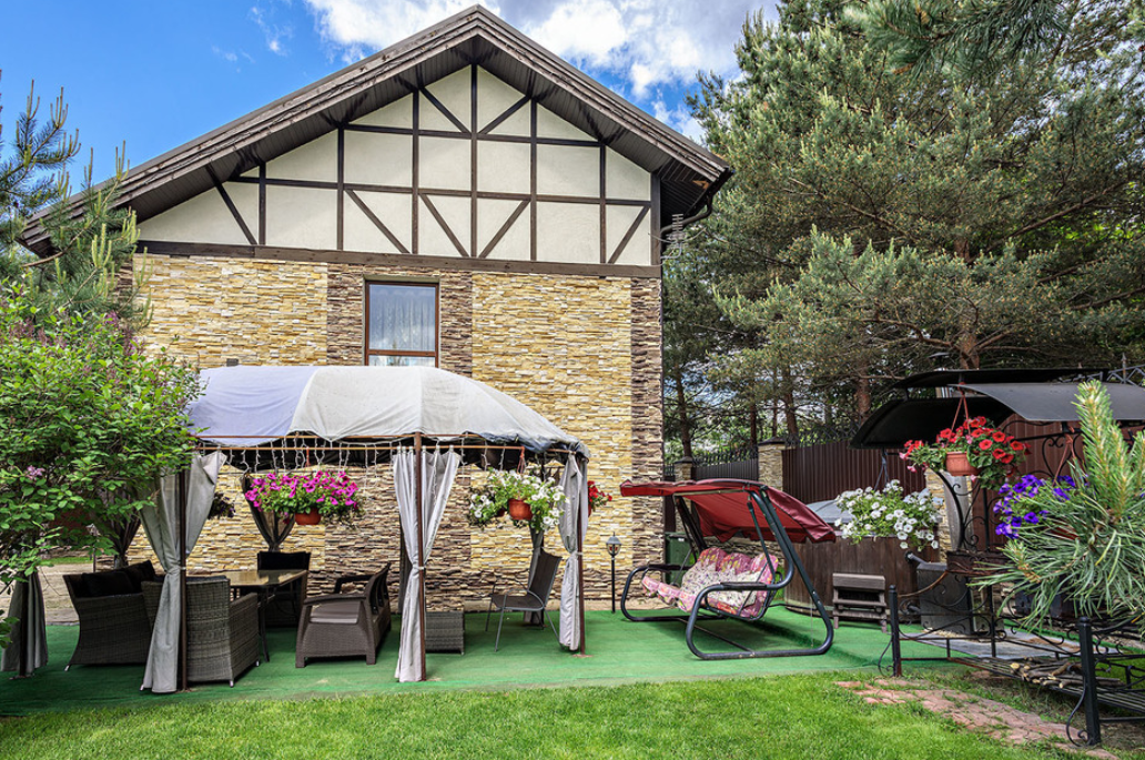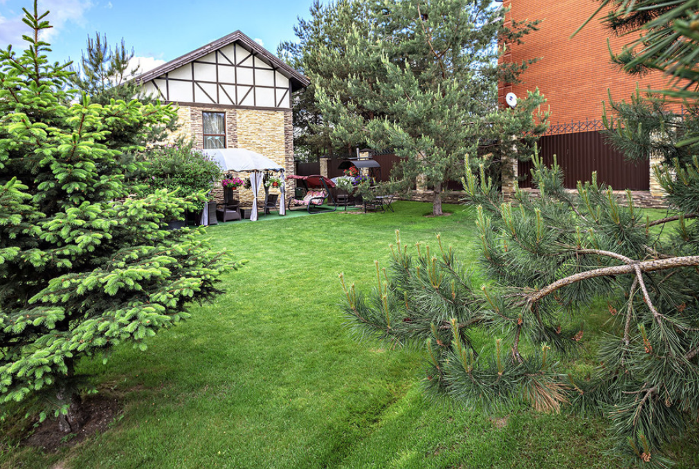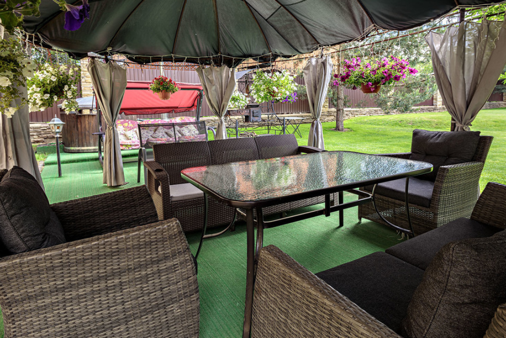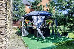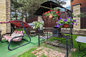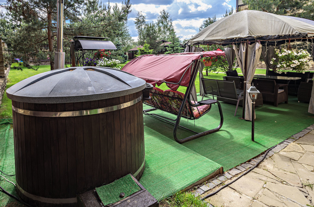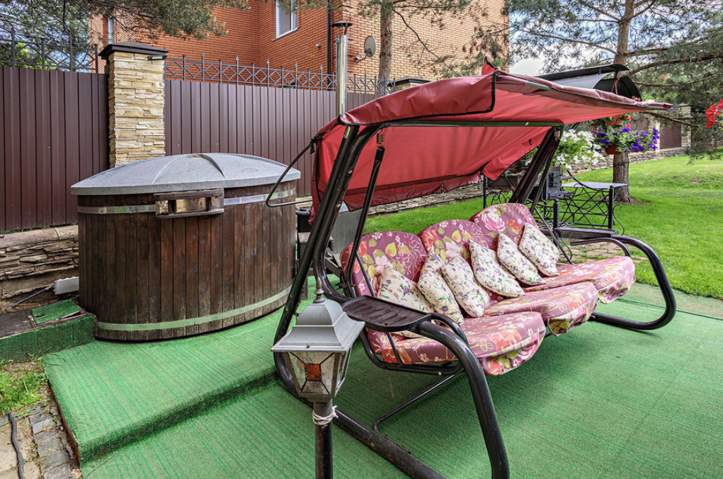 На территории имеется уникальная японская бочка фурако — уличный аналог джакузи с гидромассажем, подсветкой и горячей водой, которая топится дровами. Для дружеских посиделок оборудована просторная крытая беседка (на 10 человек) с мангальной зоной, печкой для плова, казаном, шампурами и решетками. К услугам гостей плетеная уличная мебель с мягкими подушками и садовые качели. Бесплатная парковка вмещает до 5 автомобилей, территория находится под круглосуточной охраной. Рядом расположен смешанный хвойный лес, изобилующий грибными местами.