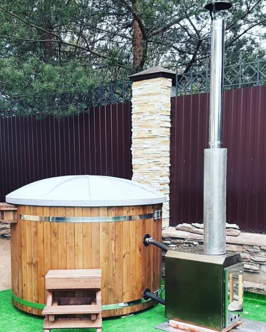 Японская бочка фурако на улице с гидромассажем и подсветкой и горячей водой (за дополнительную плату). Топится дровами.