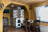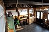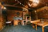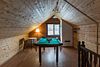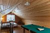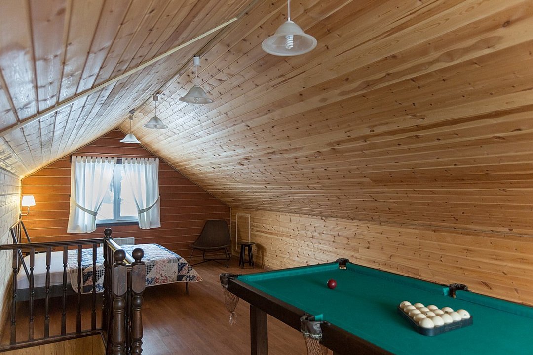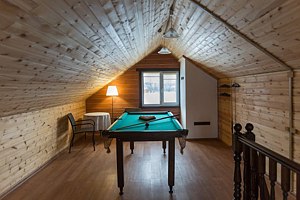 На первом этаже диван, стол с лавочками, печь для приготовления шашлыка, чайник, кружки, телевизор. На втором этаже просторная комната отдыха с бильярдом.