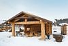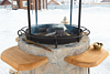 В беседке стол, скамьи, телевизор, чайник. Для любителей созерцания огня, в беседке устроен небольшой камин.