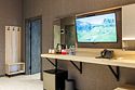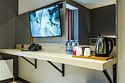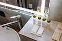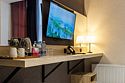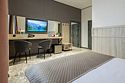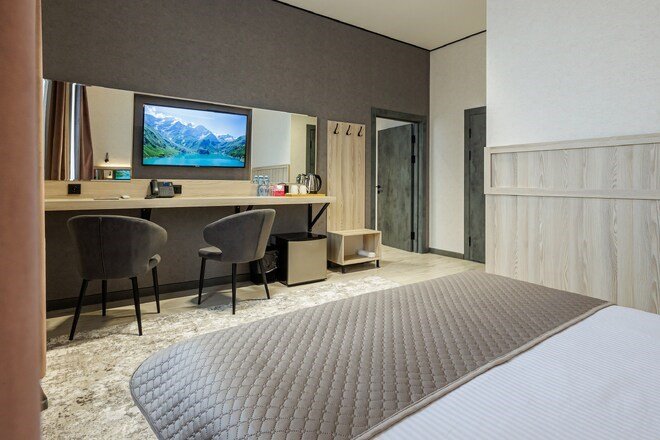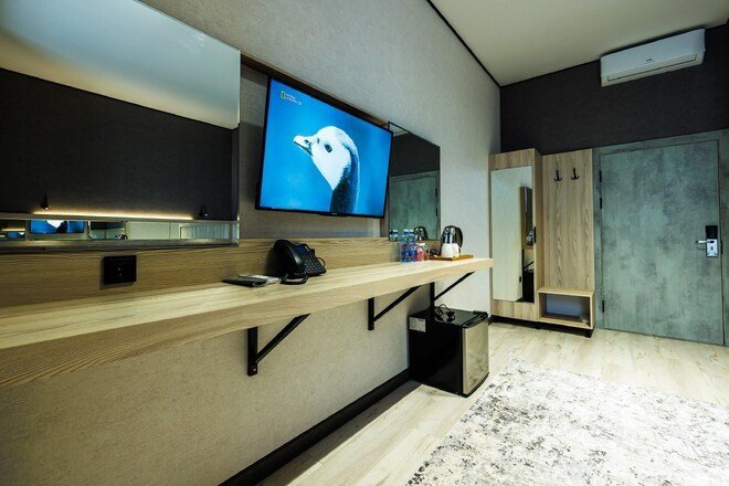 телевизор, Wi-Fi, интернет, холодильник, кондиционер, фен, электронные замки, халаты, тапочки, косметические средства, двуспальная кровать, кресла, шкаф для одежды, вешалки, зеркало, ковер, чайный набор, сейф, чайник, унитаз, косметическое зеркало, душ, вид на город, ламинат, туалетный столик, туалетные средства, внутренний телефон, рабочий стол, чайная станция, уборка номера, туалетные принадлежности премиум-класса, бутилированная вода, мылоВ гостиничном номере
