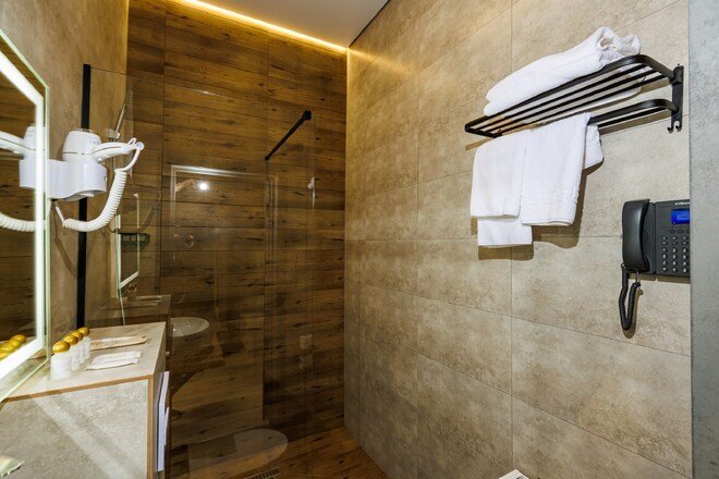 телевизор, Wi-Fi, интернет, холодильник, кондиционер, фен, электронные замки, халаты, тапочки, косметические средства, две односпальные кровати, ортопедический матрас, унитаз, душ, вид на город, туалетные средства, внутренний телефон, туалетные принадлежности премиум-класса, шапочка для душа, мылоВ гостиничном номере