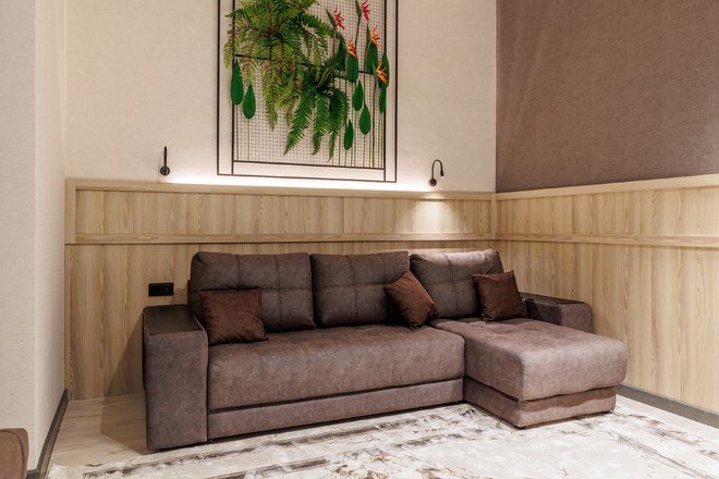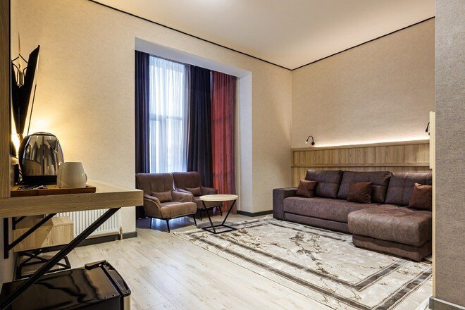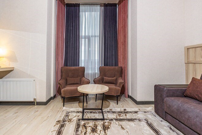 Двухкомнатный номер с архитектурным элементом «Эркер» в гостиной и спальня оформленная в современном стиле.Услуги и удобства
