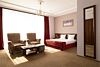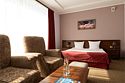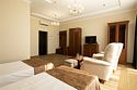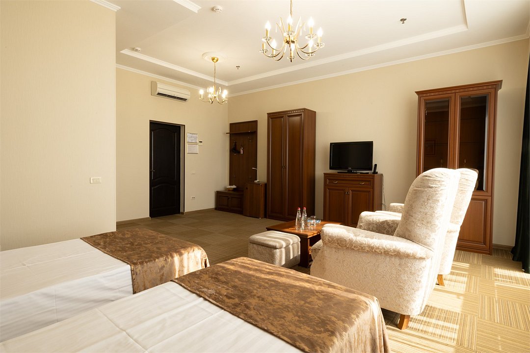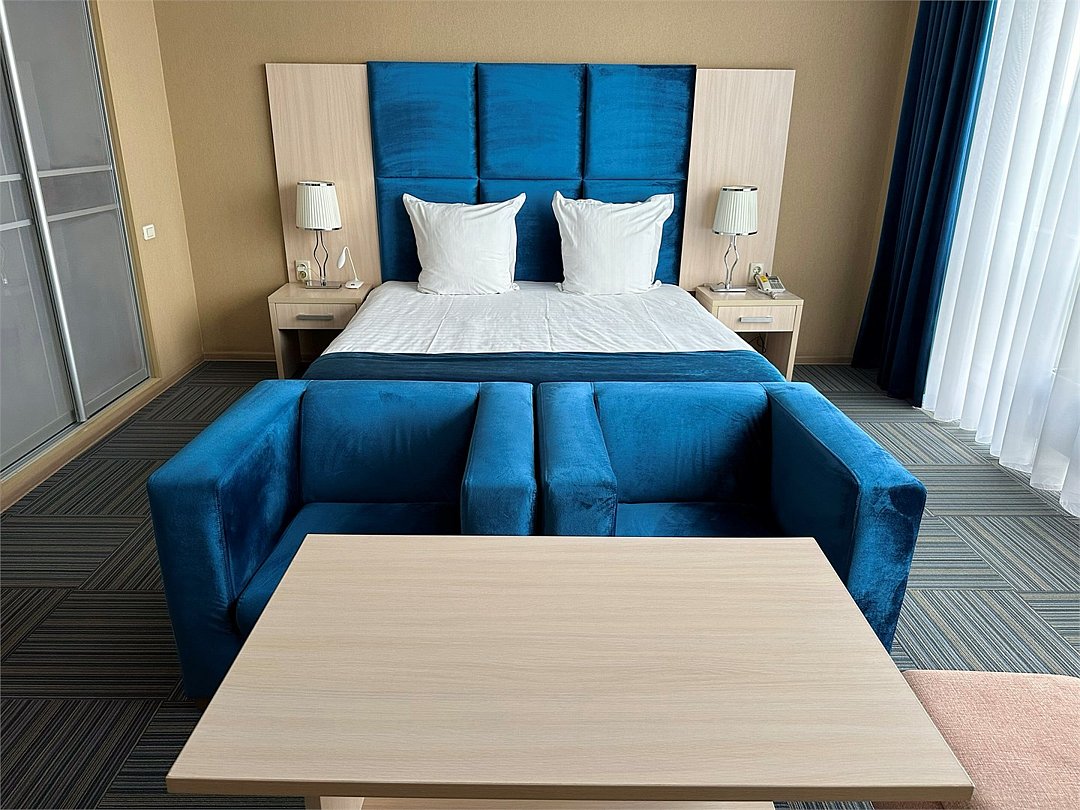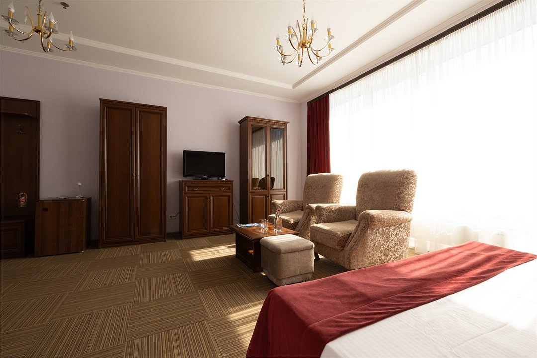 Комфортабельный стандартный номер в классическом стиле. Номер удобен для семейного или романтического размещения, мебель из массива, классический дизайн, гипоаллергенный. Просторный номер с панорамными окнами и видом на город (двор) или парк. Просторная спальня гостиная с большой кроватью King-size. В номере к услугам гостей : спутниковое телевидение; Wi-Fi; кондиционер; приборы для управления освещением и доступом в номер; телефон (для поддержания связи с обслуживающим персоналом); сейф; холодильник; мягкий домашний текстиль (халаты, тапочки, полотенца) набор посуды. Также в номере есть зона отдыха с журнальным столиком и креслами, шкаф - гардероб для одежды, фен, чайник.Услуги и удобства