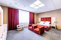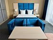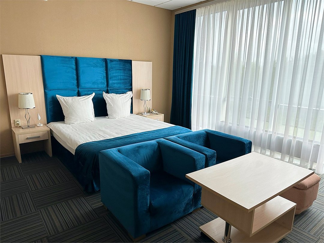 Современный уютный номер для спокойного отдыха. Просторный номер с панорамными окнами и видом на город или парк. Просторная спальня гостиная с одной большой кроватью и гипоаллергенным текстилем. В номере к услугам гостей : спутниковое телевидение; Wi-Fi; кондиционер; приборы для управления освещением и доступом в номер; телефон (для поддержания связи с обслуживающим персоналом); сейф; холодильник; гостиничная парфюмерия; домашний текстиль; набор посуды. Также в номере есть зона отдыха с журнальным столиком и креслами, шкаф - гардероб для одежды, фен, чайник.Услуги и удобства