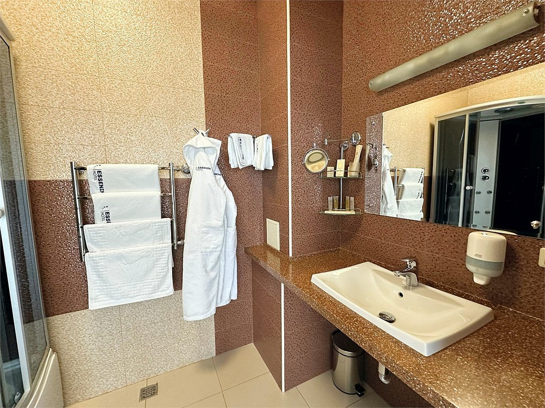 телевизор, кабельное телевидение, Wi-Fi, холодильник, кондиционер, светильник, фен, электронные замки, утюг, душевая кабина, халаты, банные полотенца, тапочки, гигиенические средства, кровать «King size», кресла, тумбы, гардеробная, вешалки, журнальный столик, зеркало, чайный набор, набор посуды, информационная карта, меню, сейф, чайник, косметическое зеркало, питьевая вода, ковровое покрытие, кулер на этаже, вид во двор, стаканы, столовые приборы, туалет, вид на парк, внутренний телефон, шкаф-купе, гостиничная парфюмерия, фитнес-зона, чайная станция, уборка номера, вешалки-плечики, без питомцевВ номере