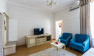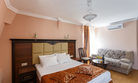 Номер состоит из трех комнат: спальни, гостиной и кухни. Комнаты, оформленные в классическом современном стиле. Расположены на втором этаже первого корпуса. Кухня полностью оборудована столовыми и кухонными принадлежностями, печью СВЧ, газовой плитой. Есть номер с балконом.