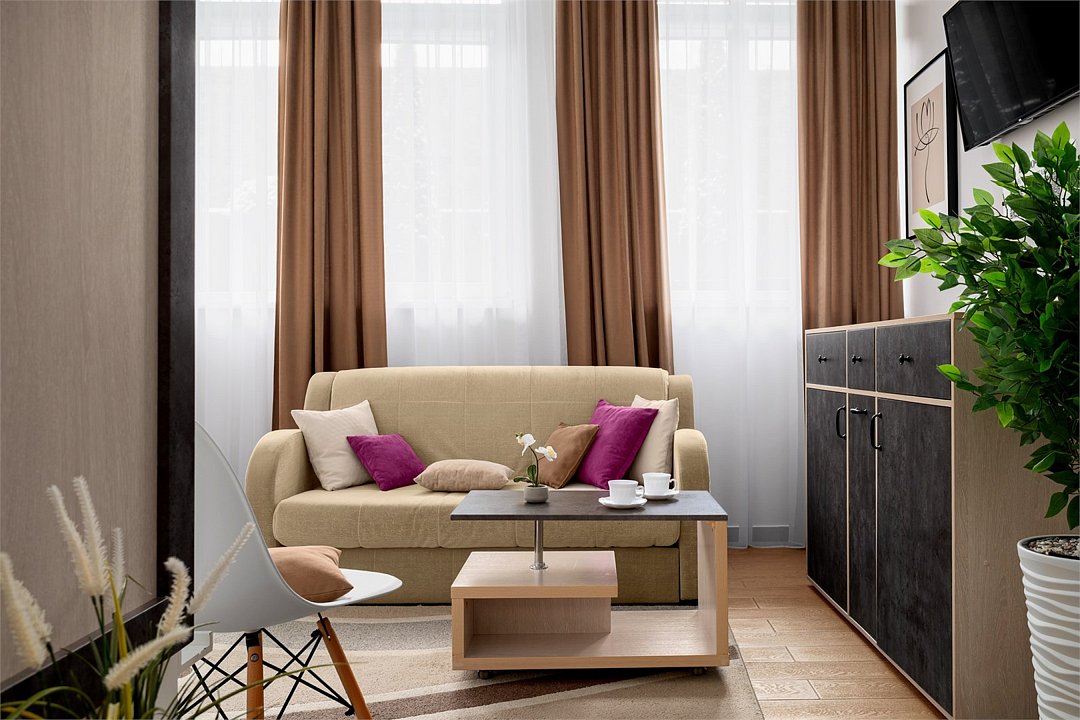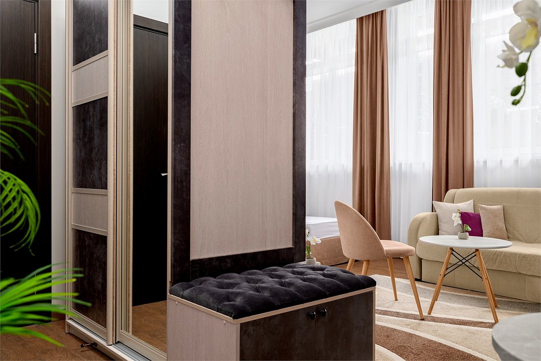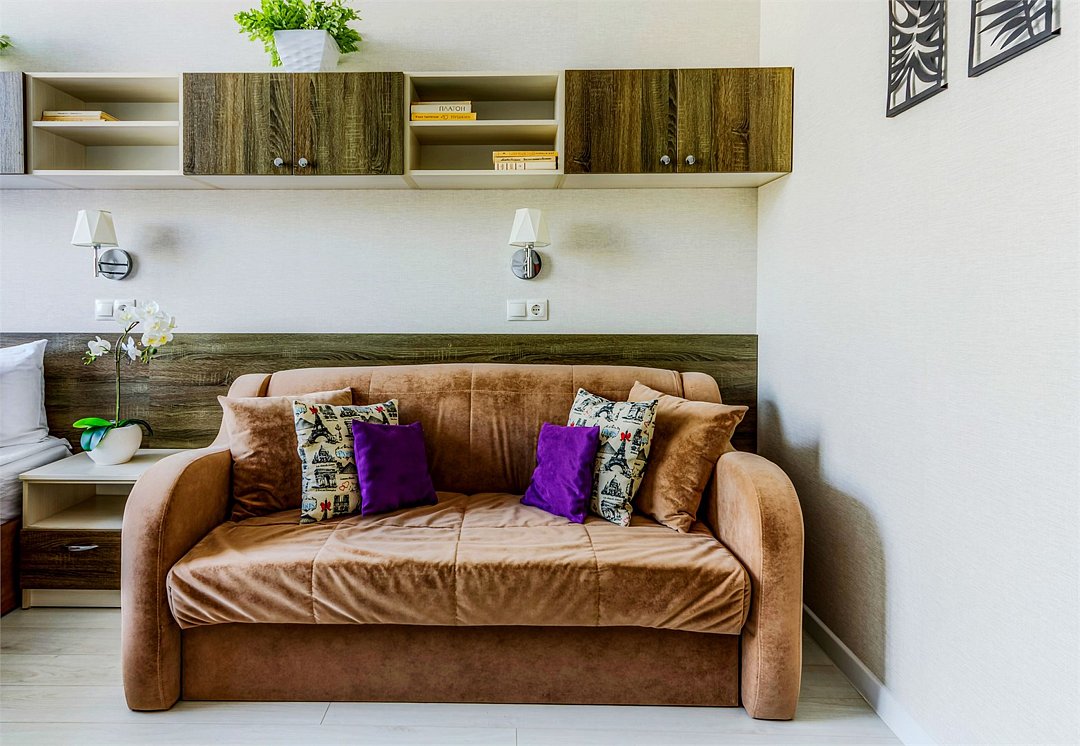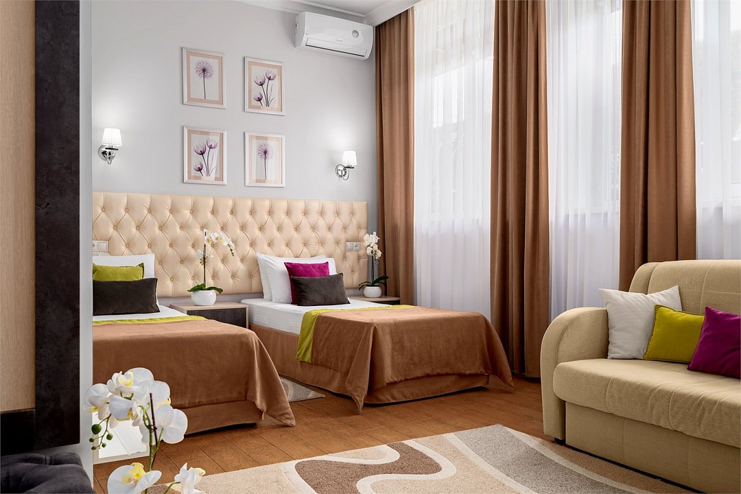 Предлагаем вам LUX (студио комфорт) площадью 30 м², который подходит от 2-х до 5-х гостей. Вы можете выбрать между двуспальной кроватью или двумя односпальными, а также воспользоваться раскладными двуспальным диваном и евро раскладушкой. В номере вас ждут следующие удобства: • Удобная мебель • Кондиционер • Телевизор • Холодильник • Душ в ванной комнате • Фен • Сейф • Бесплатный Wi-Fi • Приветственный набор (чай, кофе и бутилированная вода) По приезде Вам необходимо будет заплатить ТУРИСТИЧЕСКИЙ НАЛОГ (ТН) - это новый местный налог, который заменяет Курортный сбор. Туристический налог оплачивается только наличными во время заселения – одновременно с оплатой размещения.Услуги и удобства