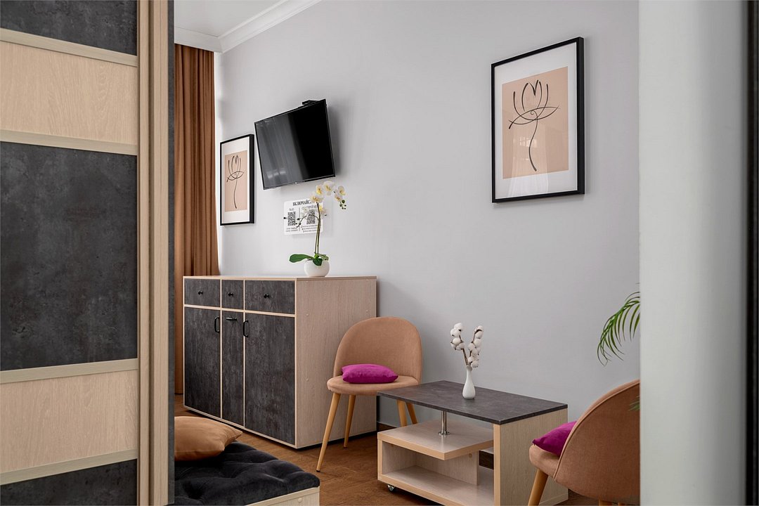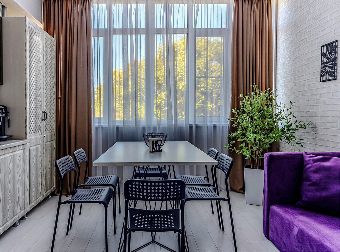 APART + мини кухня - это 2-хместные комфортные номера, площадью 18 м², которые отлично сочетают в себе: спальную, кухонную и гостевую зоны, с двуспальной или двумя раздельными односпальными кроватями на выбор. Дизайнерское оформление номеров, окна с подсветкой, которые выглядят очень реалистично и эффектно, роллеты с автоматическим ручным управлением на проветривание и открывание окна. В комфорте номеров предусмотрено ВСЁ: • Удобная мебель • Кондиционер • Телевизор • Кухня с холодильником, мультиваркой и чайной станцией • Обеденный стол • Душ и санузел в ванной комнате • Фен, махровые полотенца, халаты • Сейф • Бесплатный Wi-Fi • Приветственный набор (чай, кофе и бутилированная вода) • Тёплые полы По приезде Вам необходимо будет заплатить ТУРИСТИЧЕСКИЙ НАЛОГ (ТН) - это новый местный налог, который заменяет Курортный сбор. Туристический налог оплачивается только наличными во время заселения – одновременно с оплатой размещения.Услуги и удобства