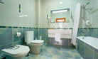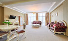интерьер номера выполнен в классическом итальянском стиле с присущей ему вычурностью и дороговизной обстановки. В гостиной комнате расположен итальянский мебельный гарнитур – удобный диван и два кресла, журнальный столик для чаепитий. Также здесь есть туалетный столик с уже приготовленным набором различных косметических средствУслуги и удобства