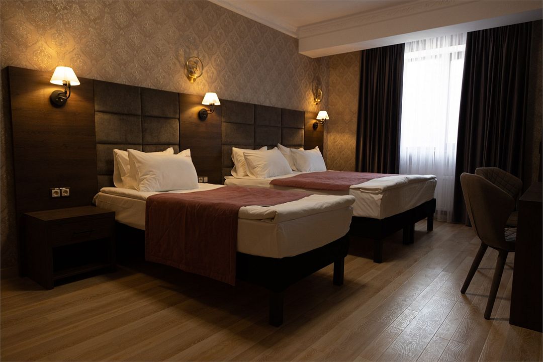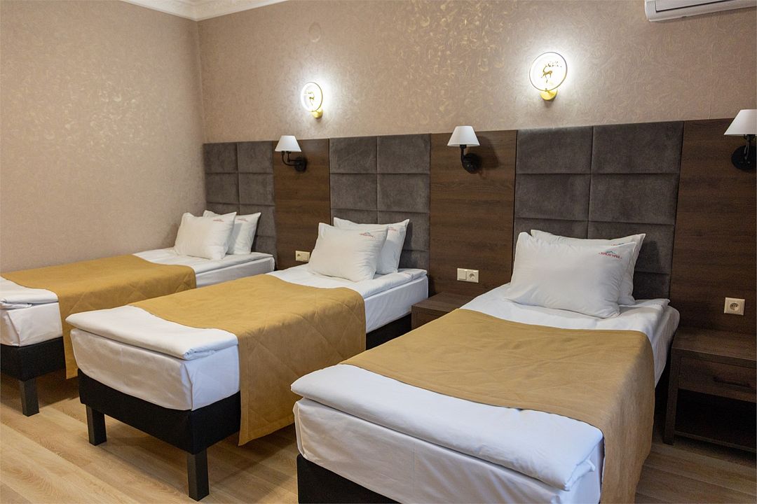 Номер категории "Комфорт" с 3-мя раздельными кроватями. Площадь номера - 25 кв. м Максимальное размещение: до 3 гостей. В номере: 3 односпальные кровати, стол с зеркалом, шкаф-гардероб, телевизор и спутниковое ТВ, сейф, душ, туалет, ванные и косметические принадлежности, фен, 3 полотенца на гостя, тапочки, мини холодильник, кондиционер, балкон с мебелью, Wi-FiУслуги и удобства