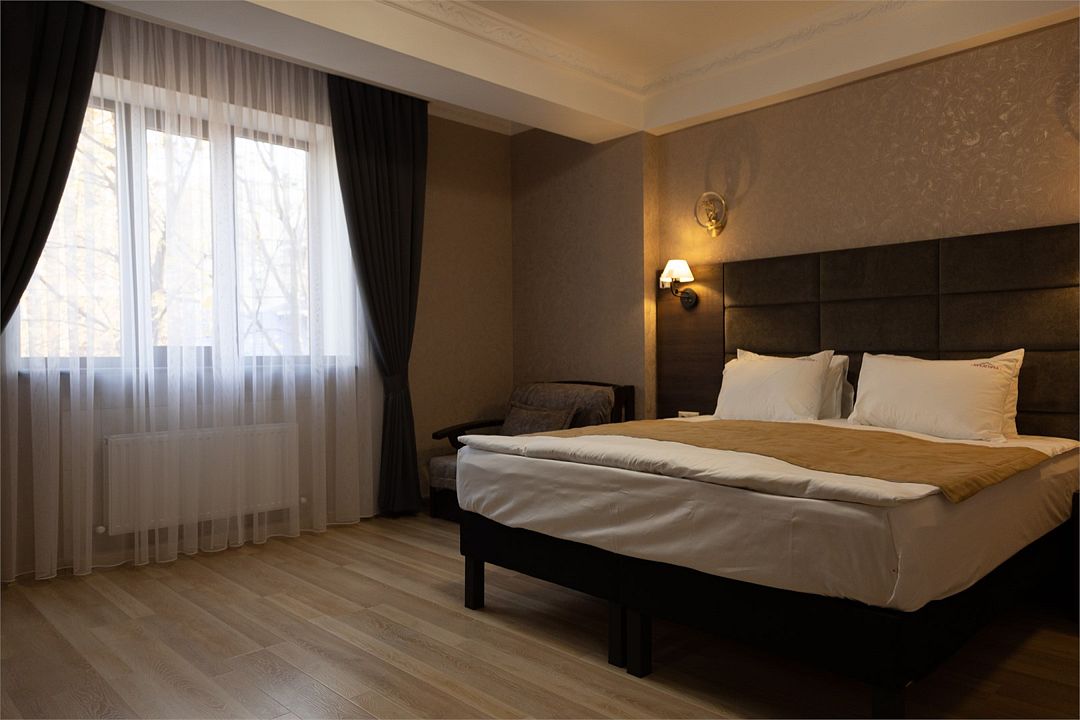 Junior 2х местный. Однокомнатный номер. Площадь номера - 25 кв. м Максимальное размещение: до 3 гостей. Доп. место – кресло-кровать. В номере: 1 двуспальная кровать, кресло-кровать, стол с зеркалом, шкаф-гардероб, телевизор и спутниковое ТВ, сейф, душ, туалет, ванные и косметические принадлежности, фен, 3 полотенца на гостя, тапочки, мини холодильник, кондиционер, Wi-FiУслуги и удобства