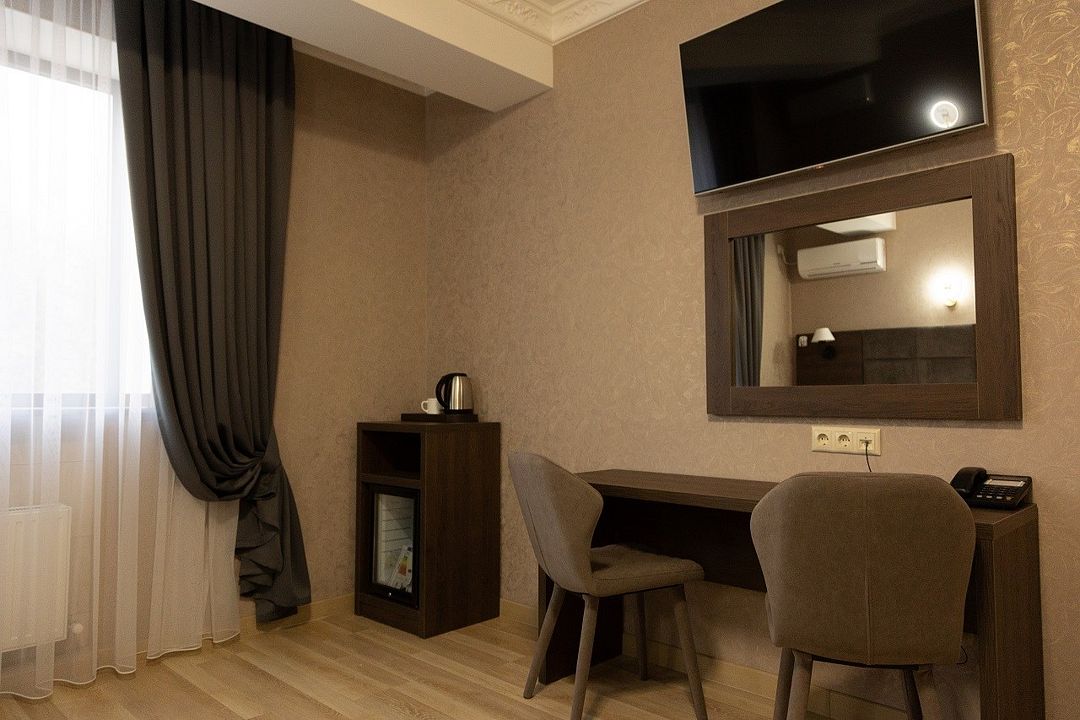 телевизор, спутниковое телевидение, Wi-Fi, интернет, холодильник, кондиционер, светильник, фен, будильник, электронные замки, утюг, санузел, биде, банные принадлежности, халаты, банные полотенца, тапочки, косметические средства, двуспальная кровать, гипоаллергенное белье, гладильная доска, стулья, зеркало, звуконепроницаемые стены и окна, чайный набор, набор посуды, обслуживание номеров, сейф, чайник, унитаз, раковина, питьевая вода, отопление, душ, вид на город, плиточное покрытие, кресло, вид во двор, высокие потолки, стаканы, стул, стол, тумба, туалетные средства, туалет, сплит-система, вид на парк, цифровое тв, внутренний телефон, телевизор с плоским экраном, мини-холодильник, москитная сетка, гостиничная парфюмерия, телевизор со Smart TV, номер для некурящих, гигиенический душ, кресло-кровать, чайная станцияВ гостиничном номере