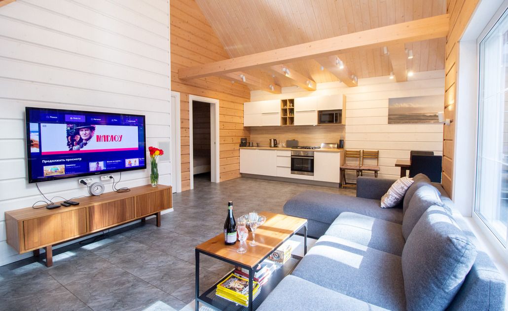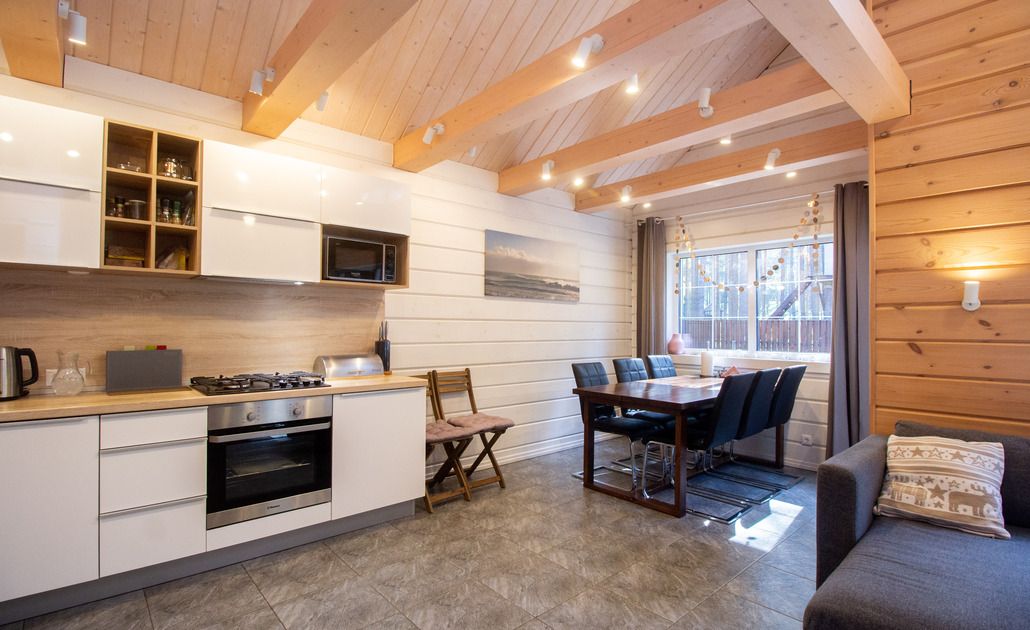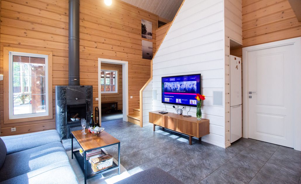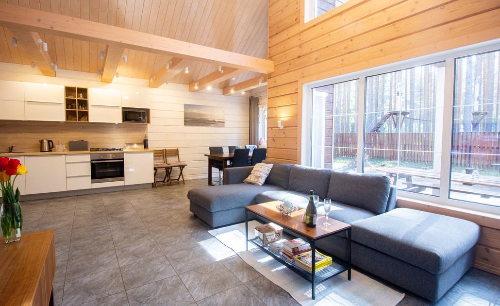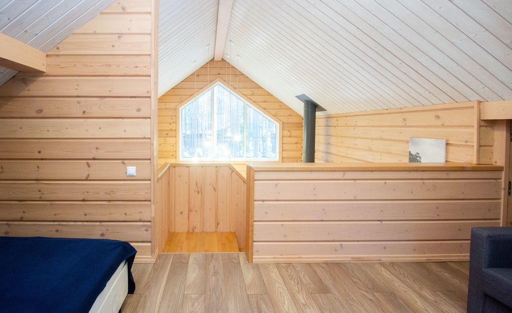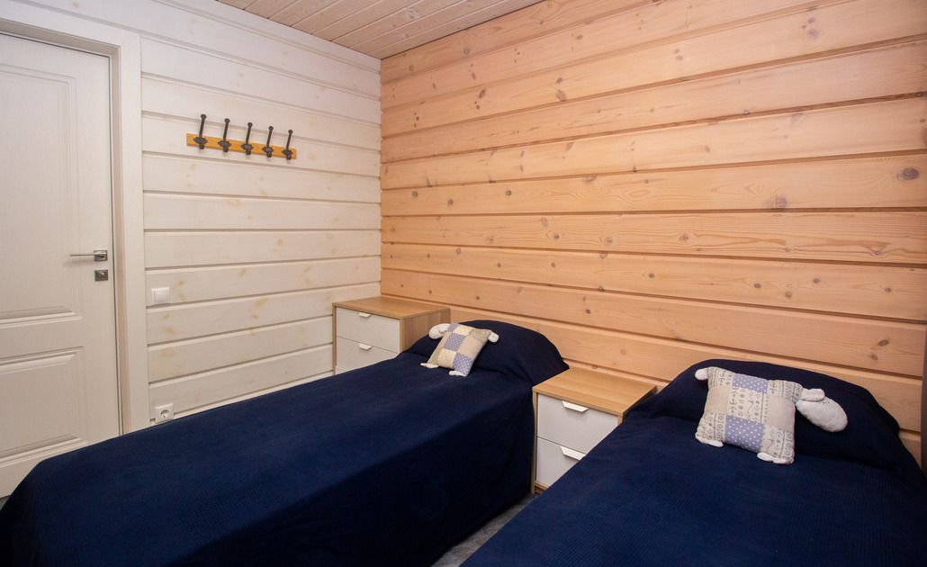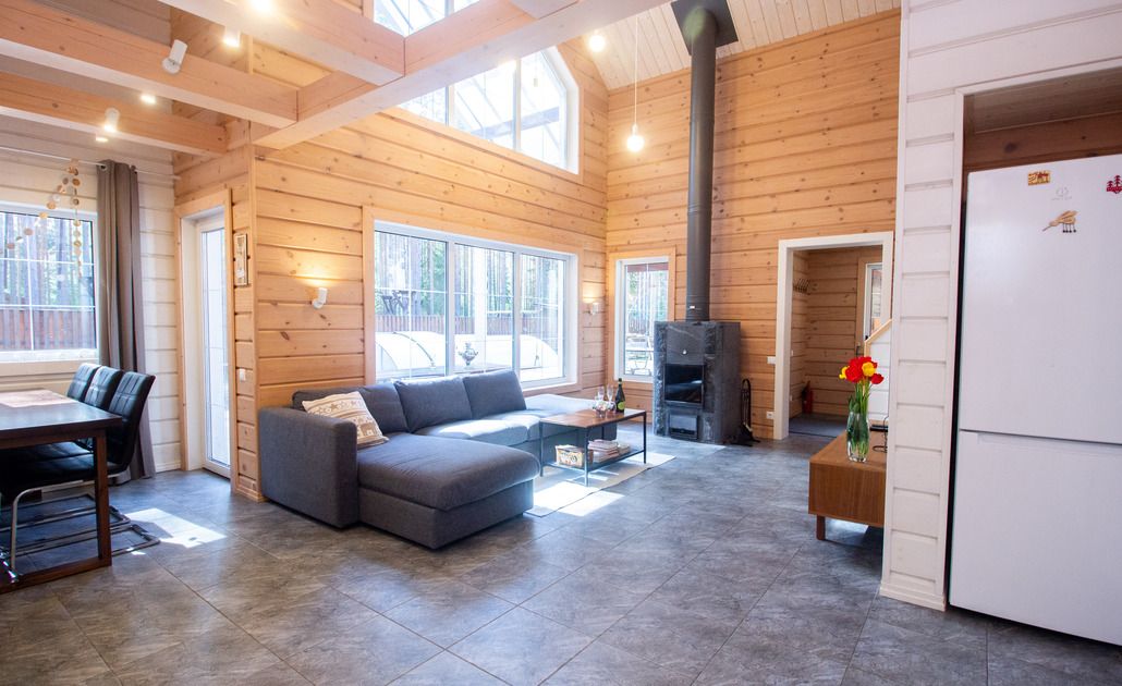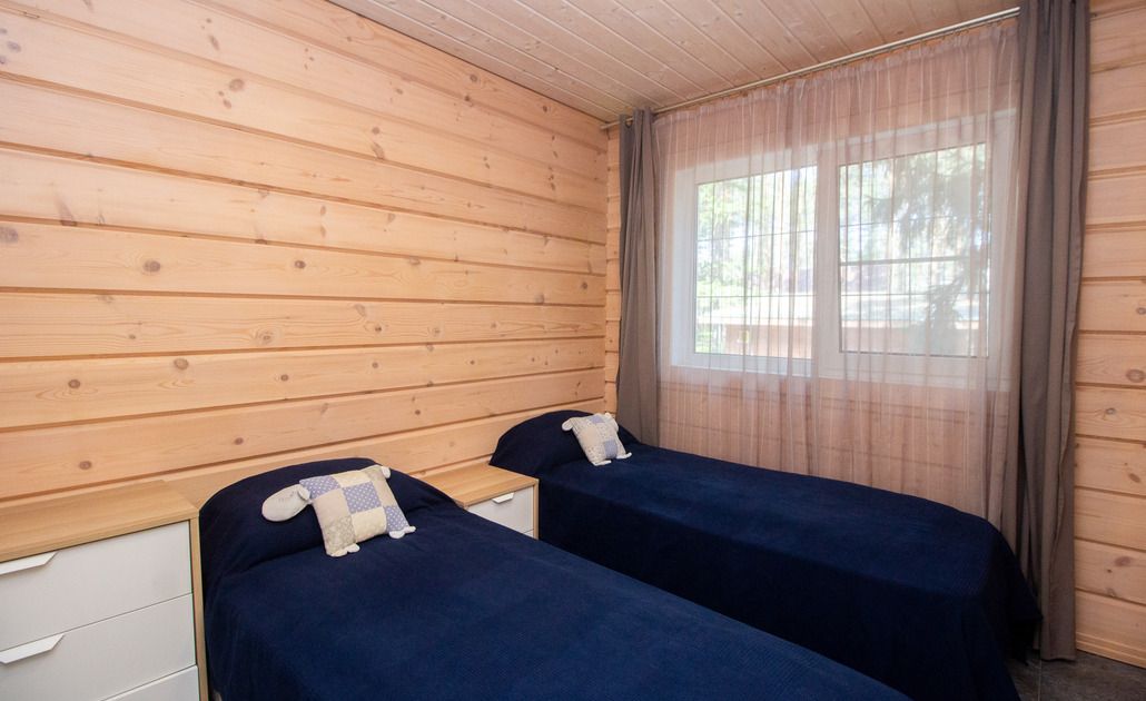Дом с тремя спальнями (максимальное количество спальных мест — 8), гостиной с кухней и камином, сауной и санузлом на первом этаже.