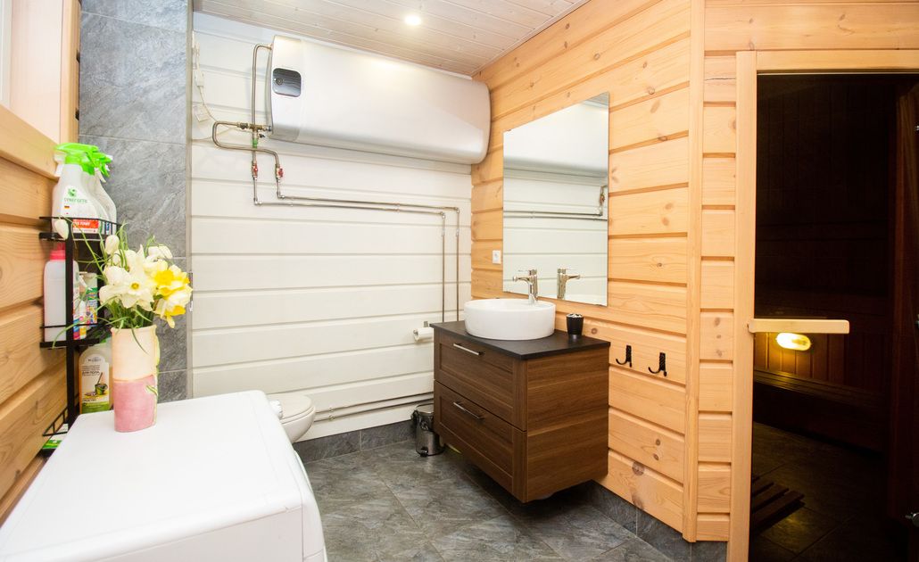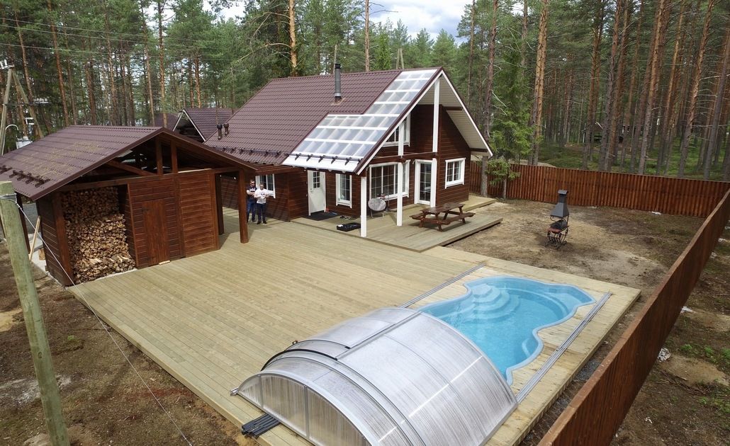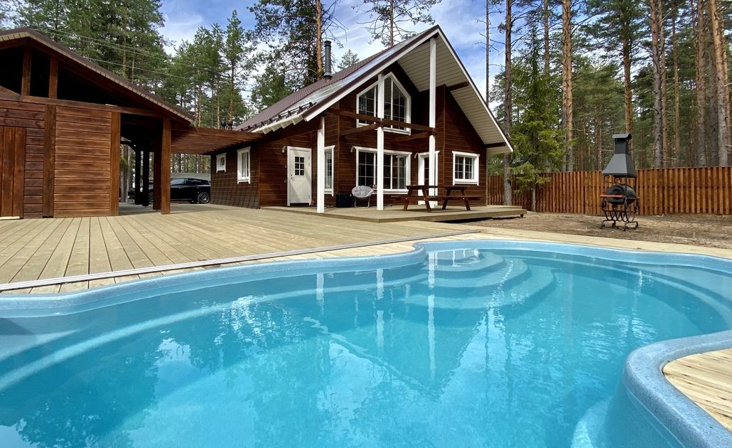 Дом из четырех комнат, оснащенный всеми удобствами для комфортного отдыха, включая сауну на первом этаже дома и подогреваемый бассейн на территории.
