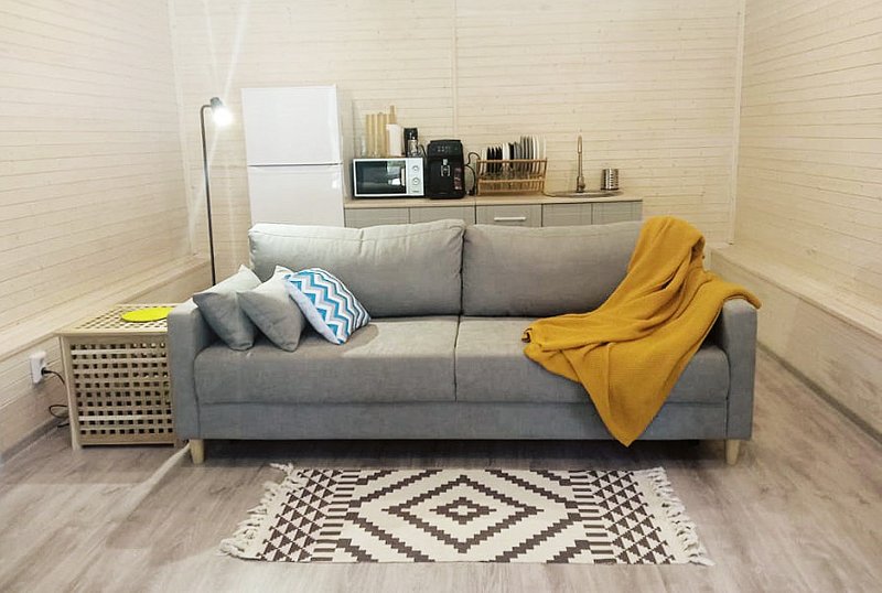- Гостиная с большим двуспальным диваном (можно использовать как дополнительное спальное место)