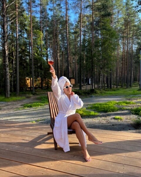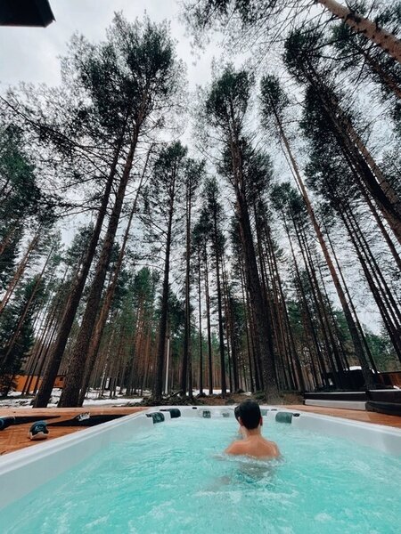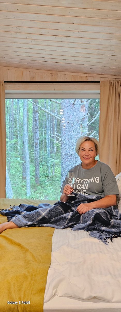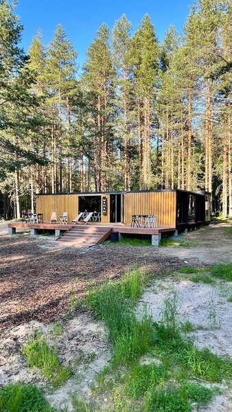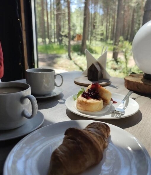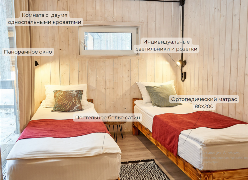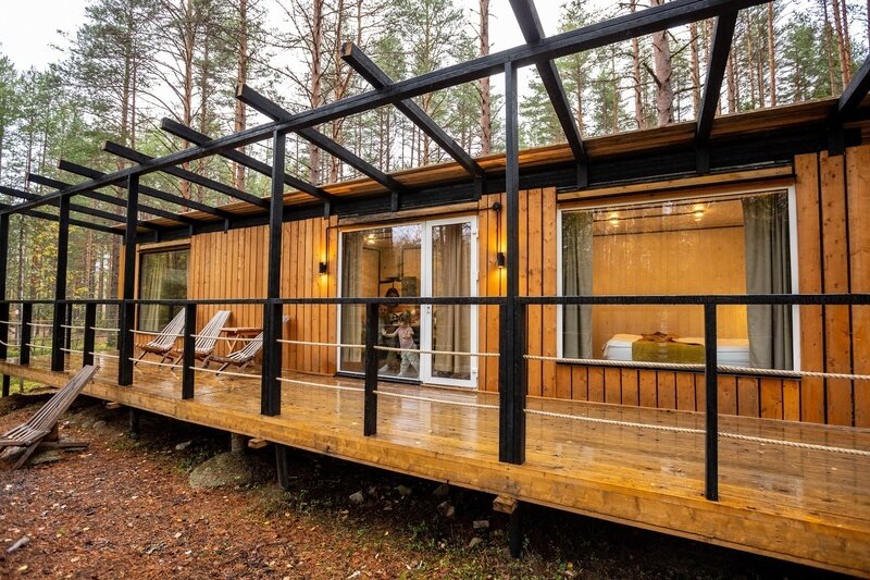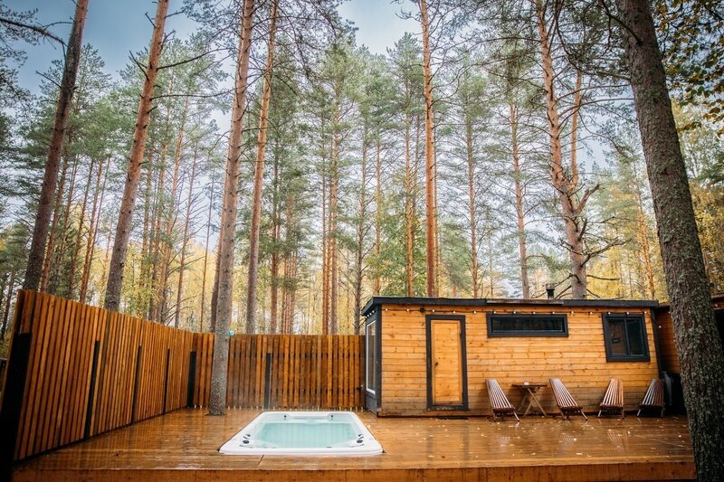 Семейный отдыхДостоинстваЗамечательный эко - отель! Расположен в лесу, чистый воздух, а черники кругом видимо - невидимо. Я насобирала за два дня 5 литров. Домик на двоих уютный, комфортный, чистый, всё, что нужно в нём есть. Персонал очень вежливый, завтраки вкусные, небольшое разнообразие, но нам на пять дней было вполне достаточно. Погода стояла тёплая, озеро рядом, пляж песчаный, накупались и назагорались. А вечером очень приятно посидеть с шашлычком на террасе, есть пледы, около каждого домика мангал. Очень понравилось, что окна в доме смотрят в лес и , что в отеле режим тишины. Огромное спасибо за чудесный отдых! Всем рекомендую данный отель!
