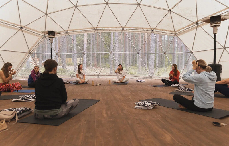 Красивый и просторный шатёр (12x12 м) с деревянным настилом, в котором удобно проводить хоть корпоративный тренинг, хоть йога ретрит.