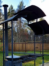 На закрытой, огороженной территории расположены: открытая терраса с уличной мебелью, мангальный комплекс (казан, шампуры), парковка и система видеонаблюдения.
