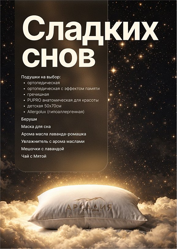 Вдохновлённый горными пейзажами и трендами биохакинга 2026 года, «Стандарт для сна» — это пространство, в котором мы превратили качество отдыха в настоящее искусство. Каждый номер этой категории оснащён расширенным меню опций сна — персональным набором инструментов для глубокого и восстанавливающего отдыха: Подушки на выбор: • Ортопедическая • Ортопедическая с эффектом памяти • Гречишная • PUPRO анатомическая для красоты • Детская 50×70 см • Allergolux (гипоаллергенная) Дополнительные опции: • Беруши • Маска для сна • Увлажнитель с аромамаслами • Аромамасла • Мешочки с лавандой • Чай с мятой Номера располагаются на третьем этаже второго корпуса. Большая двуспальная кровать, сплит-система, детская кроватка по запросу. Специальное предложение: Гостям категории «Стандарт для сна» предоставляется скидка на расслабляющий массаж — просто сообщите администратору номер своей комнаты. Стандарт для сна — когда отдых становится осознанным!Услуги и удобства