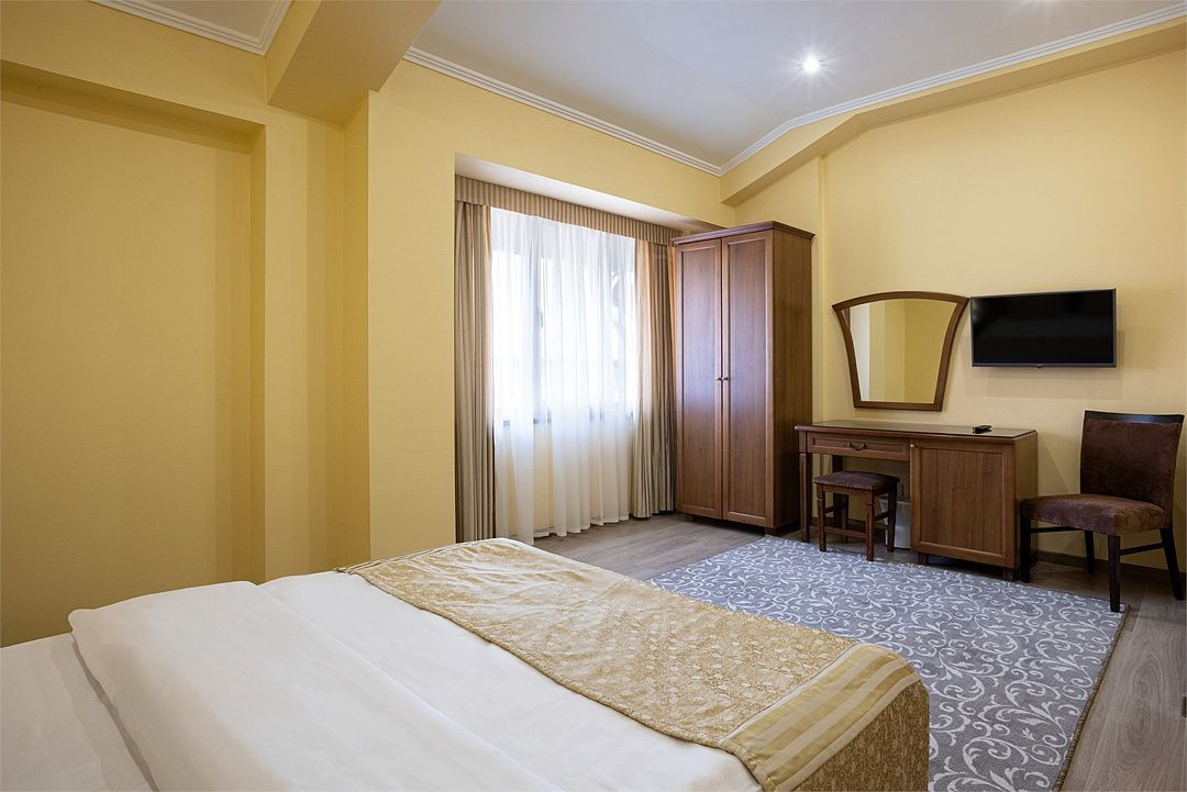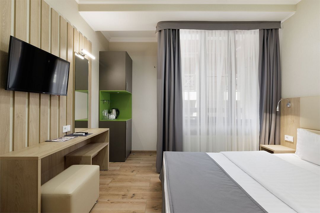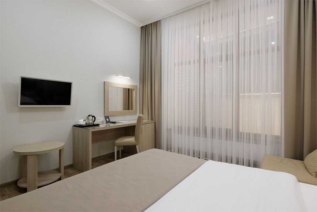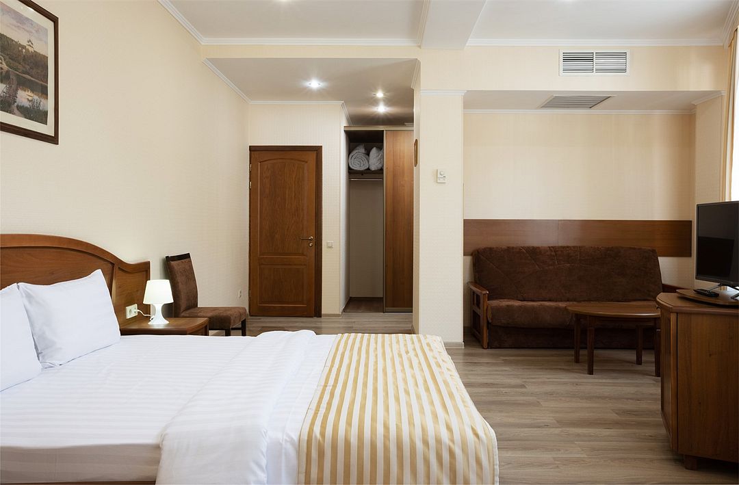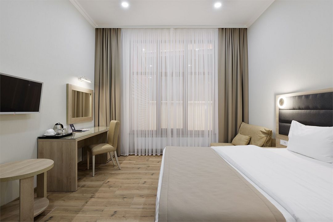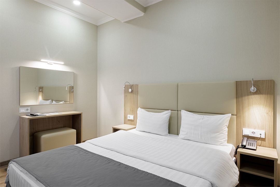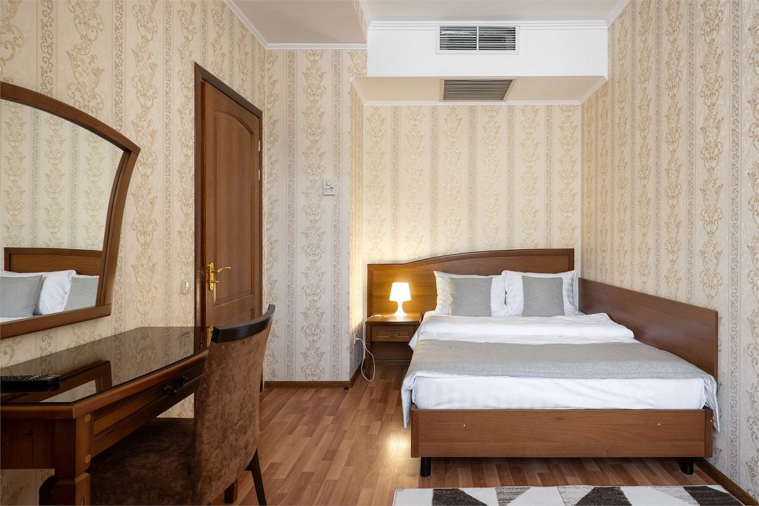 Двухместный, однокомнатный номер без балкона, двуспальная кровать с прикроватными тумбочками, шкаф, журнальный столик, туалетный столик, телевизор, холодильник. Ванная комната с комфортабельной душевой кабиной, фен, тапочки. Халаты в номерах категории Стандарт предоставляются за дополнительную плату.Услуги и удобства
