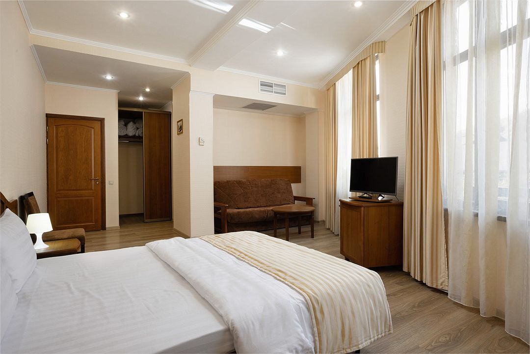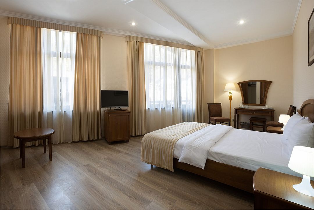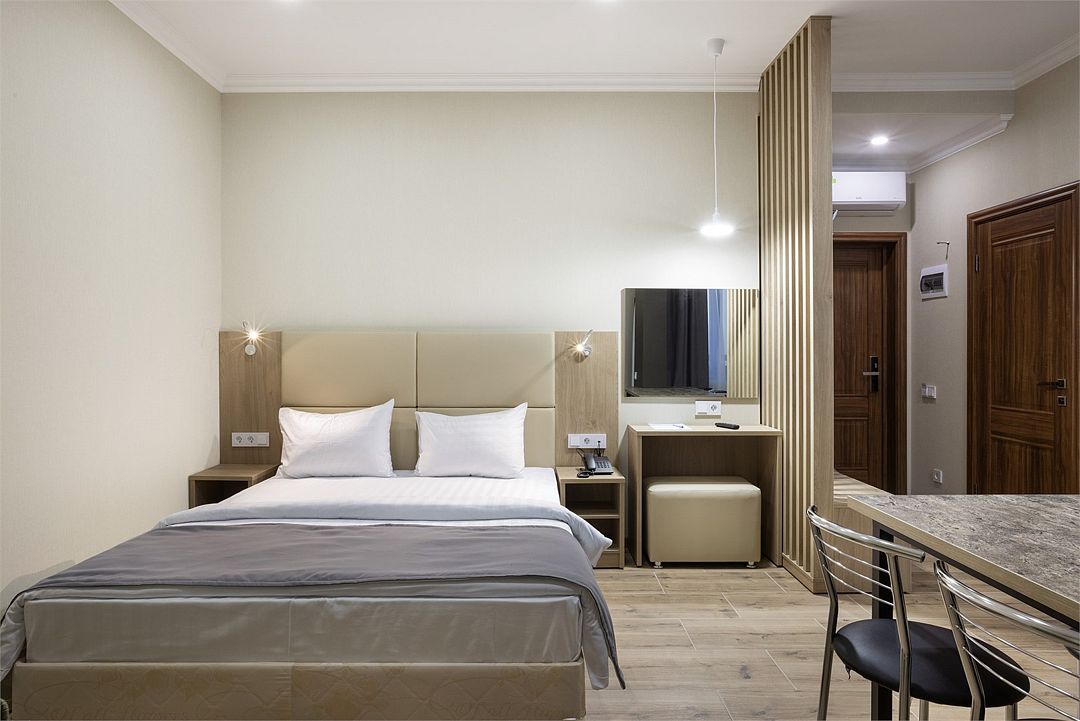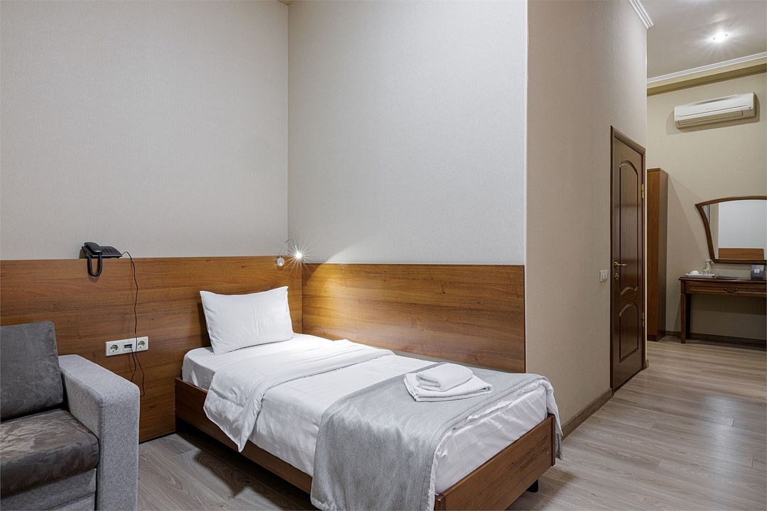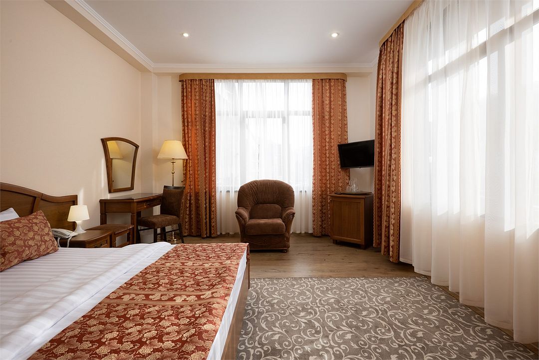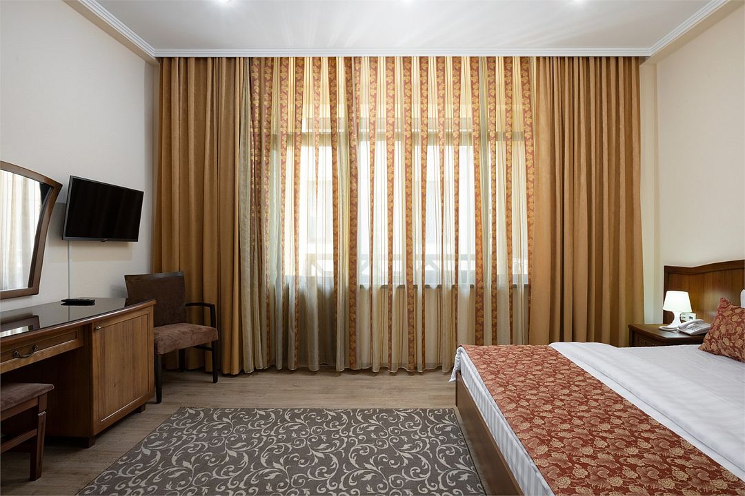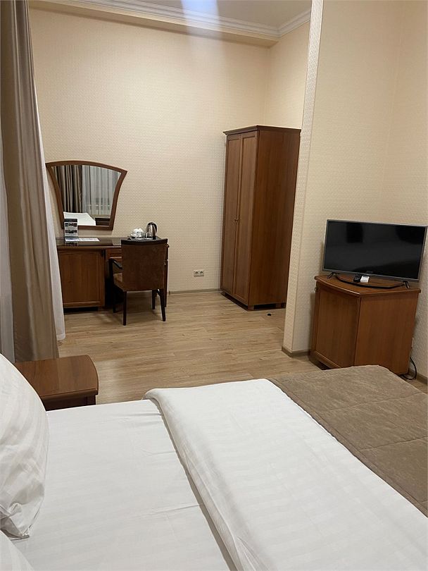 Двухместный, однокомнатный номер без балкона, двуспальная кровать с прикроватными тумбочками, шкаф, журнальный столик, туалетный столик, телевизор, холодильник. Ванная комната с комфортабельной душевой кабиной, фен, тапочки. Халаты в номерах категории Стандарт предоставляются за дополнительную плату.Услуги и удобства