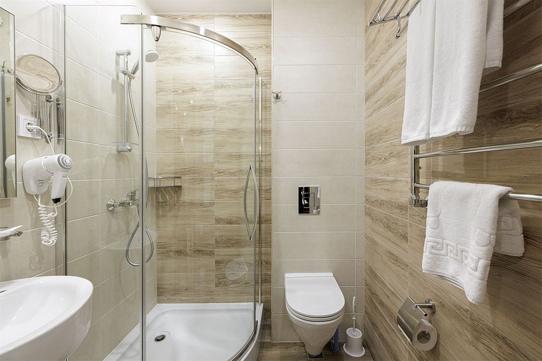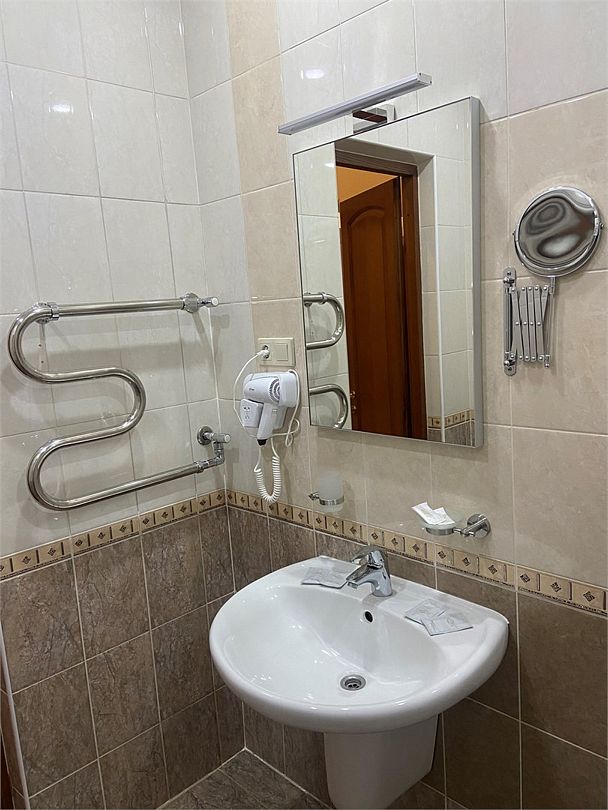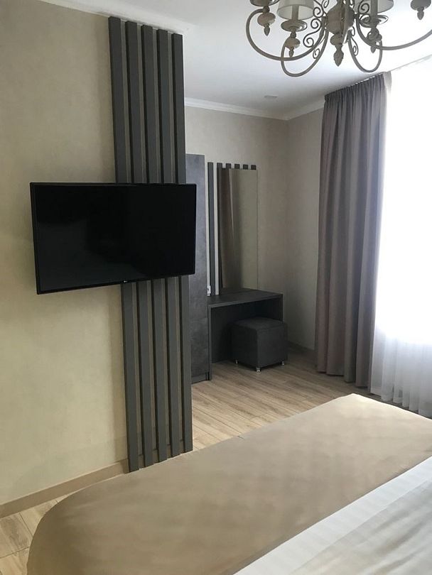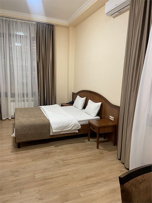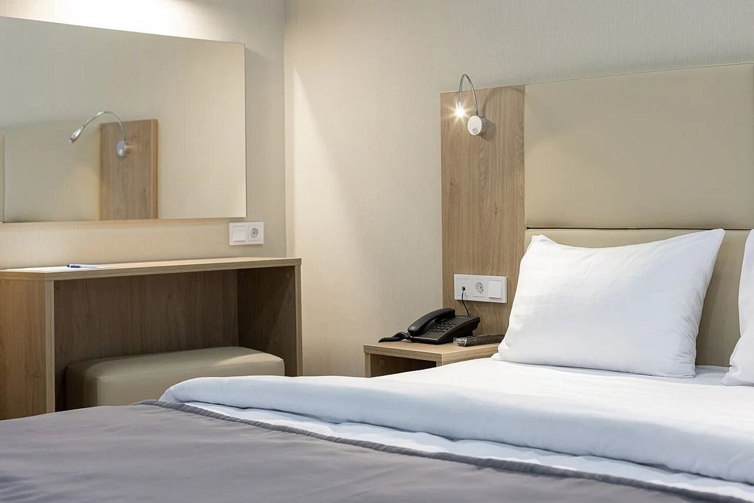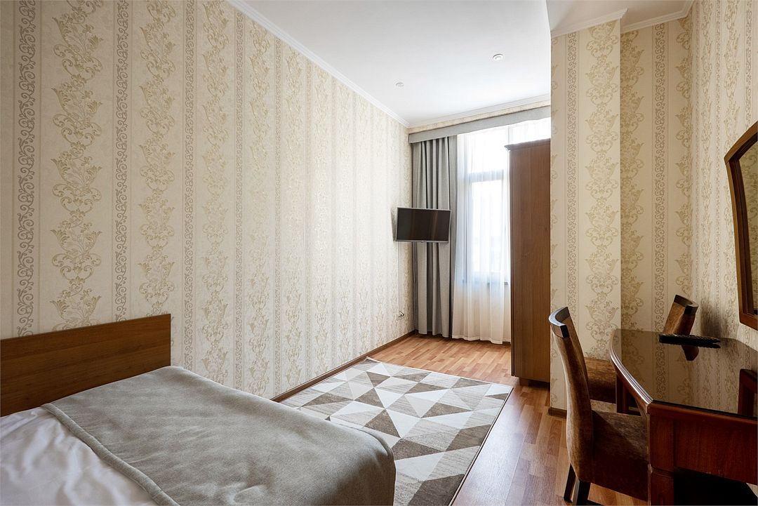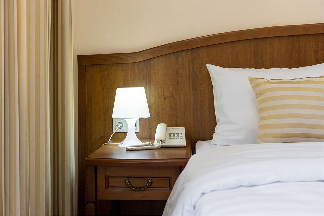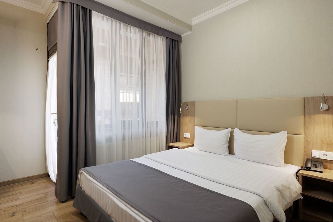 Двухместный, однокомнатный номер без балкона, двуспальная кровать с прикроватными тумбочками, шкаф, журнальный столик, туалетный столик, телевизор, холодильник. Ванная комната с комфортабельной душевой кабиной, фен, тапочки. Халаты в номерах категории Стандарт предоставляются за дополнительную плату.Услуги и удобства