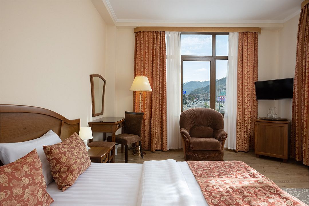Wi-Fi, кондиционер, светильник, фен, санузел, халаты, банные полотенца, тапочки, гигиенические средства, балкон с красивым видом, двуспальная кровать, полутораспальная кровать, диван, стулья, шкаф для одежды, вешалки, зеркало, раковина, мягкая мебель, душ, кулер на этаже, кресло, вид во двор, туалетный столик, туалетные средства, цифровое тв, телевизор с плоским экраном, мини-холодильник, вид на горы, рабочий столВ гостиничном номере