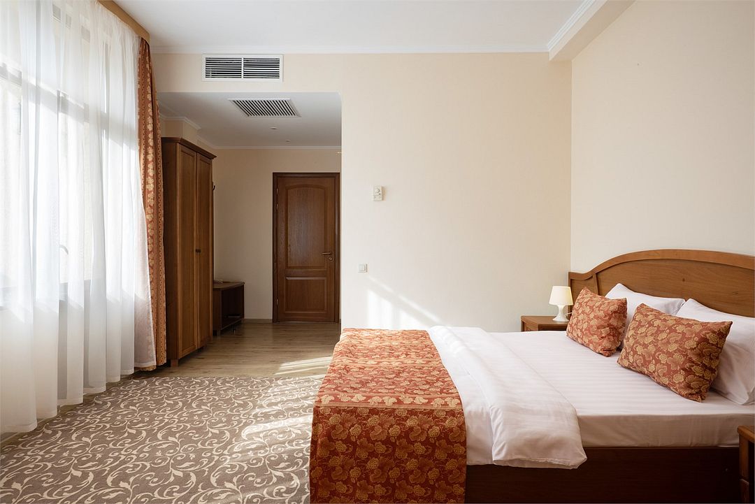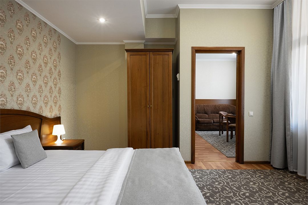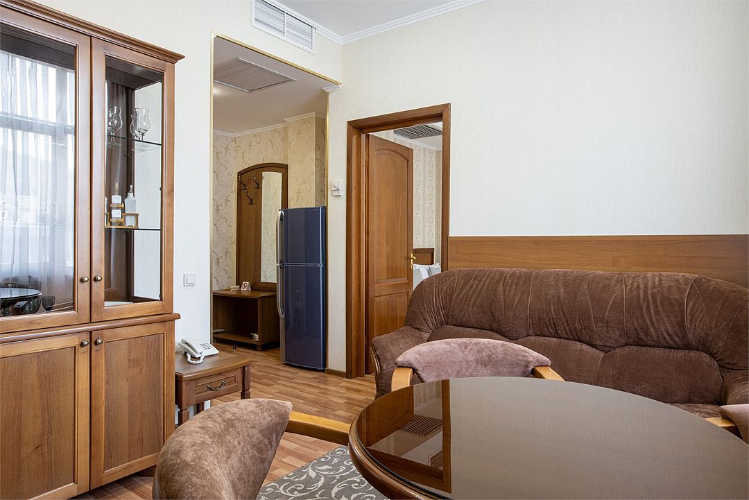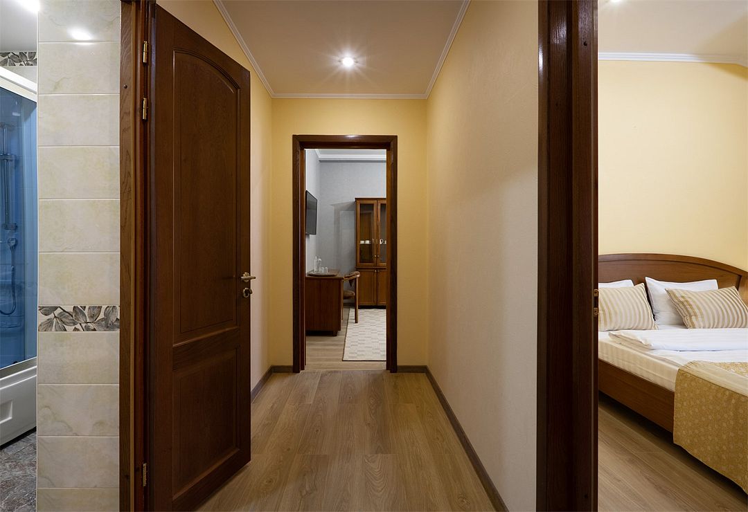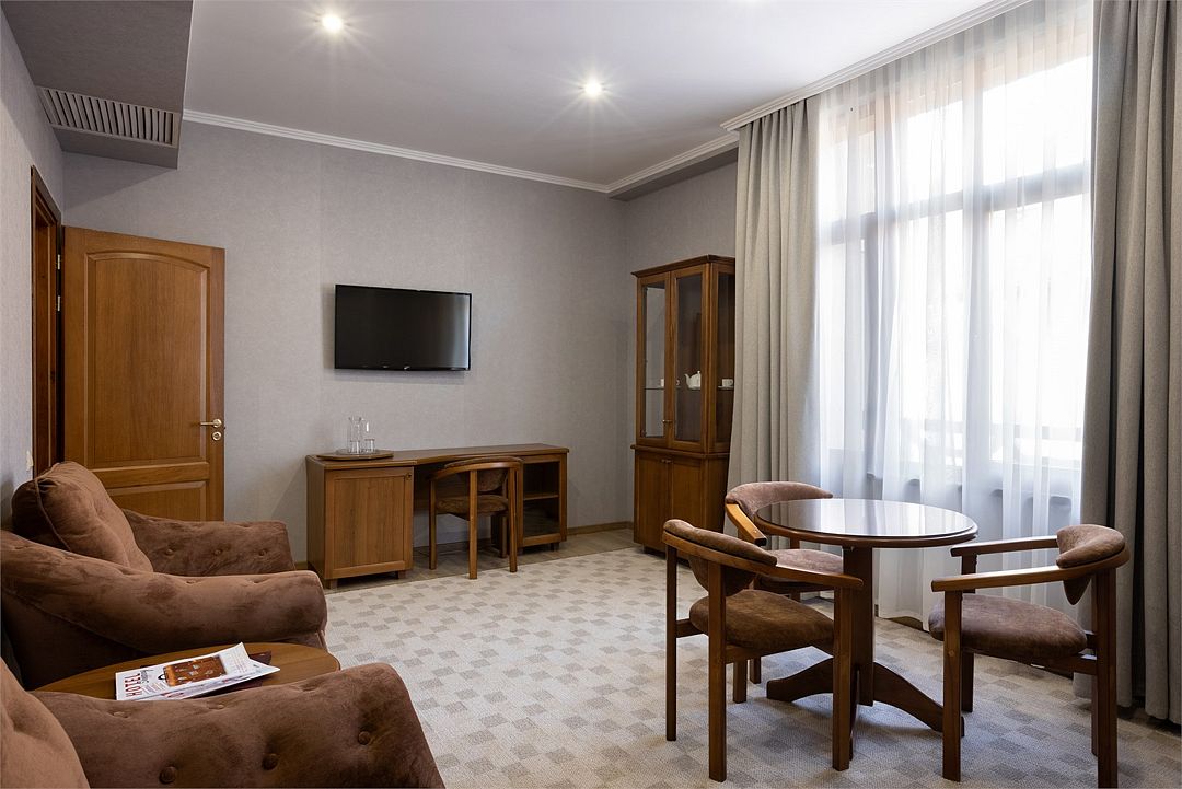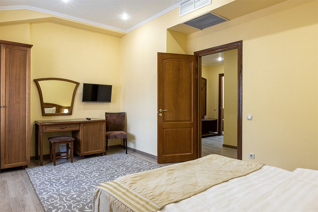Двухместный, двухкомнатный номер с балконом Спальная комната: двуспальная кровать с прикроватными тумбочками, туалетный столик, телевизор. Гостиная: набор мягкой мебели, шкаф, журнальный столик, тумба под телевизор и холодильник. Ванная комната с комфортабельной душевой кабиной, фен, халаты, тапочки.Услуги и удобства