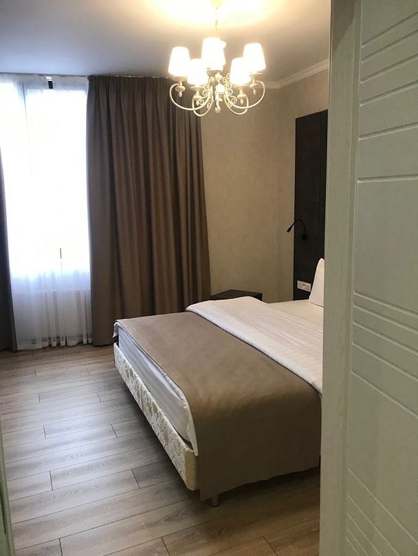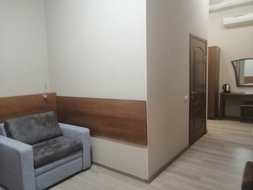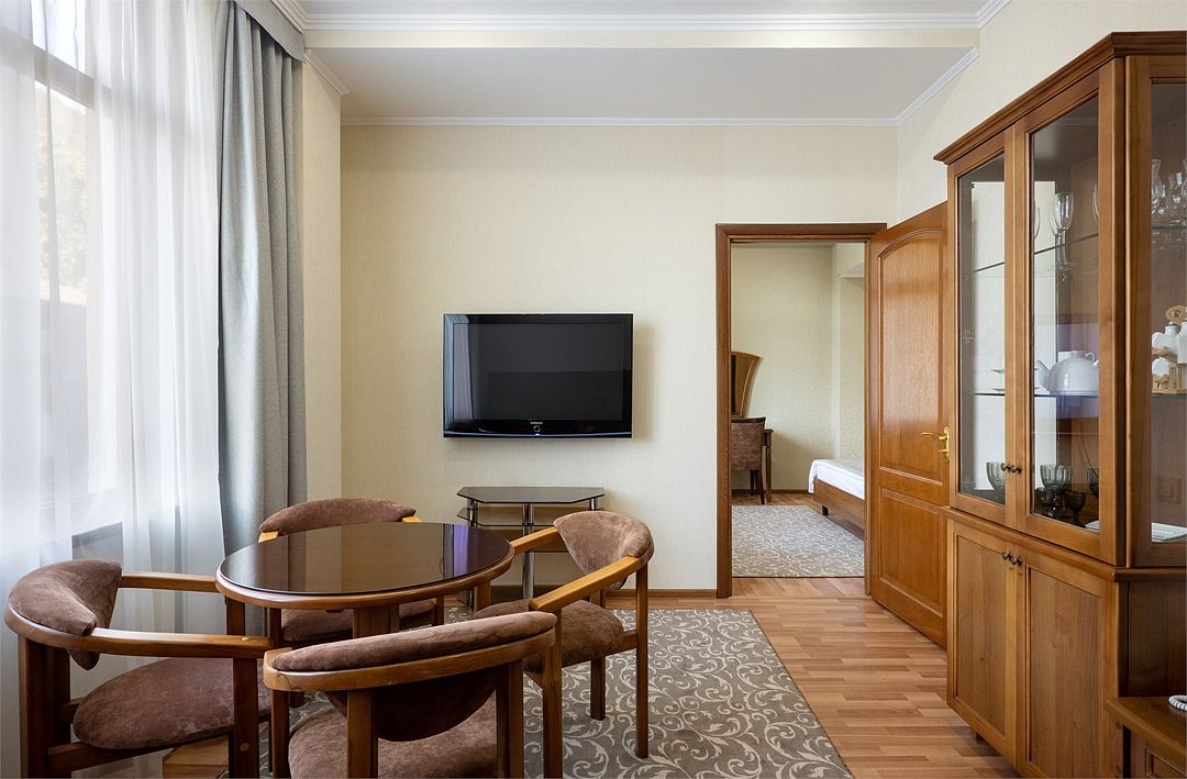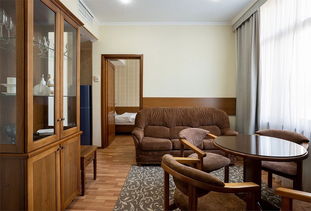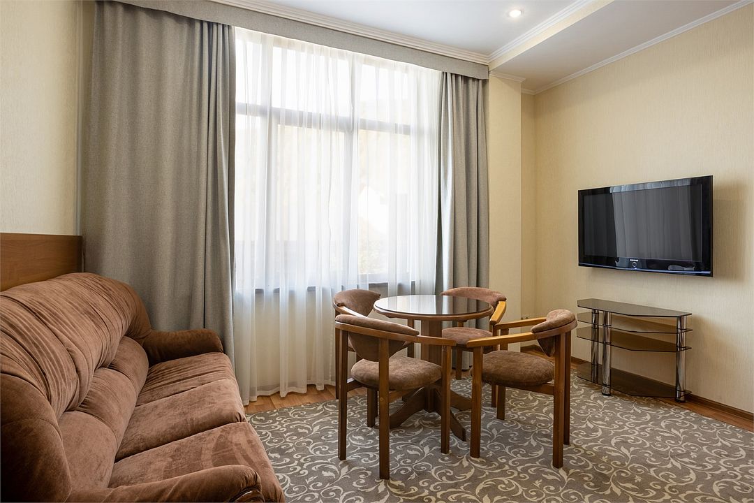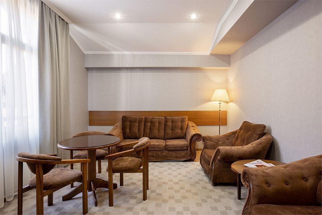 Двухместный, двухкомнатный номер с балконом Спальная комната: двуспальная кровать с прикроватными тумбочками, туалетный столик, телевизор. Гостиная: набор мягкой мебели, шкаф, журнальный столик, тумба под телевизор и холодильник. Ванная комната с комфортабельной душевой кабиной, фен, халаты, тапочки.Услуги и удобства