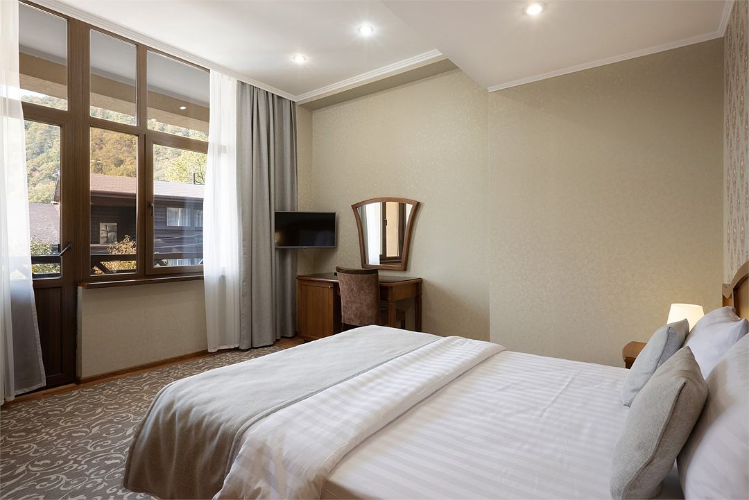 Wi-Fi, кондиционер, светильник, настольные лампы, фен, санузел, банные принадлежности, косметические средства, балкон с красивым видом, двуспальная кровать, гардеробная, вешалки, душ, кулер на этаже, вид во двор, стул, стол, туалетный столик, телевизор с плоским экраном, мини-холодильник, вид на горыВ гостиничном номере